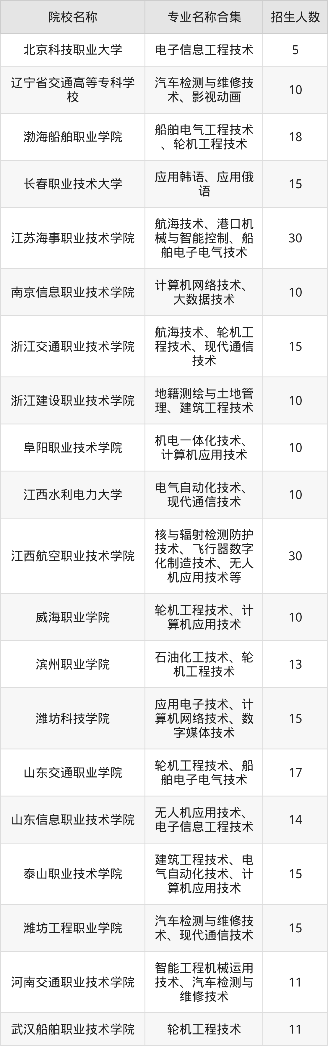 山东:威海职业学院、滨州职业学院、潍坊科技学院、山东交通职业学院、山东信息职业技术学院、泰山职业技术学院、潍坊工程职业学院