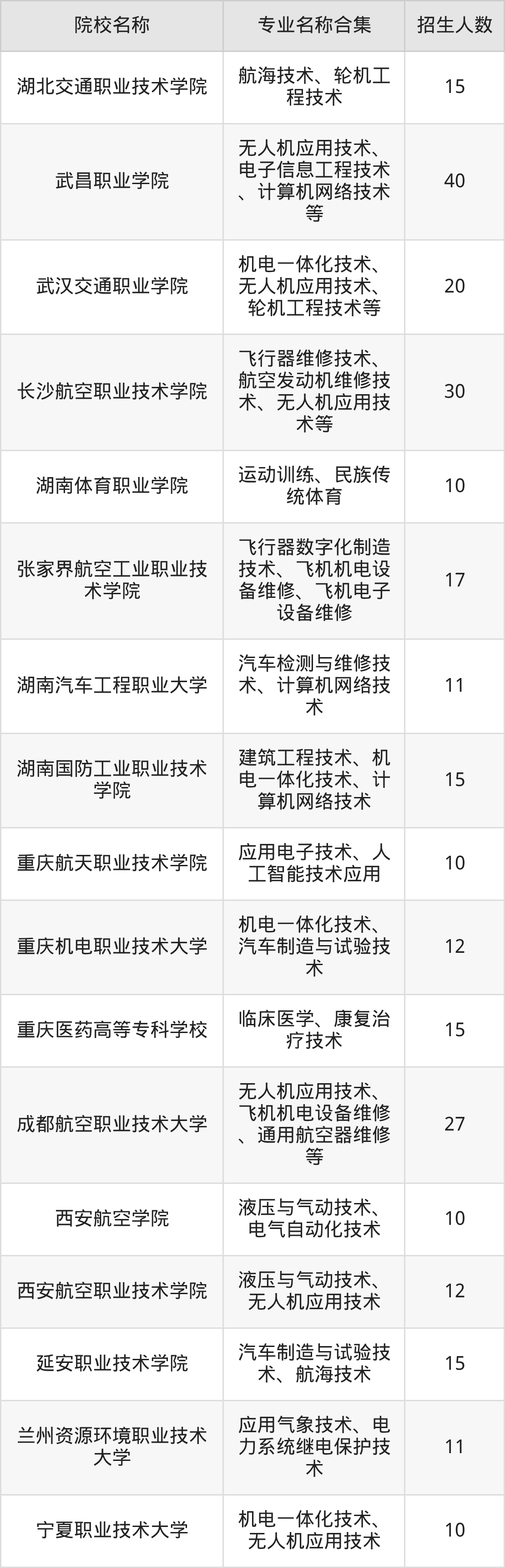 湖南:长沙航空职业技术学院、湖南体育职业学院、张家界航空工业职业技术学院、湖南汽车工程职业大学、湖南国防工业职业技术学院