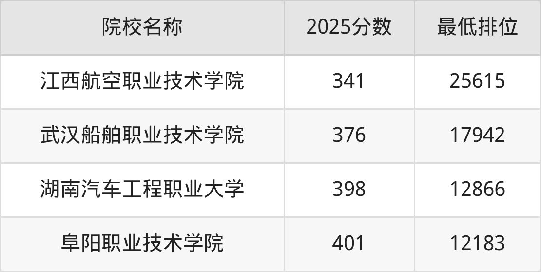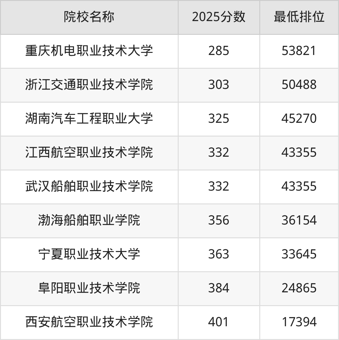 第二梯队(291-399分):浙江交通职业技术学院(303分)、湖南汽车工程职业大学(325分)、江西航空职业技术学院(332分)、武汉船舶职业技术学院(332分)
