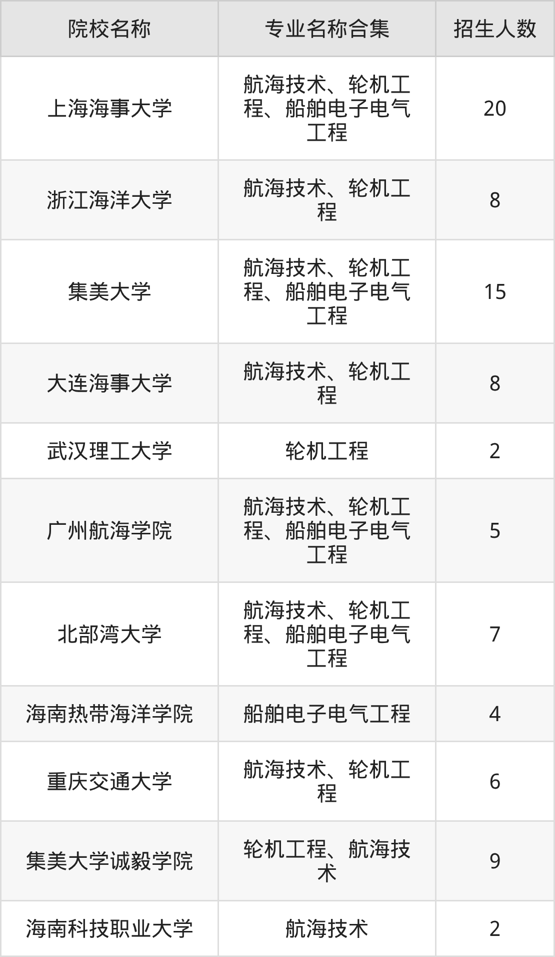 其中,上海海事大学以20人招生规模居首,集美大学15人紧随其后,集美大学诚毅学院招9人,构成招生第一梯队。