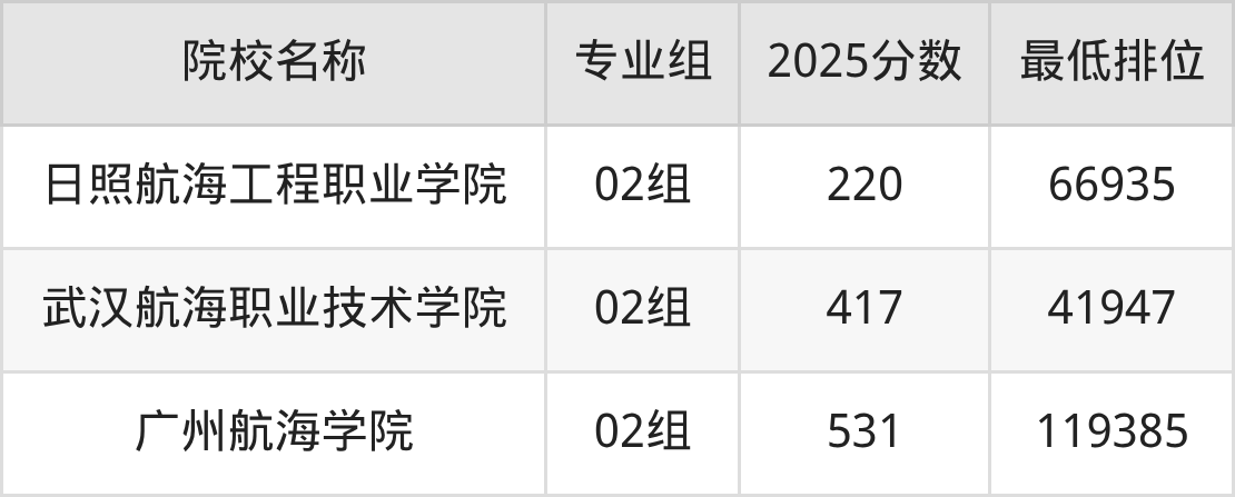 2025年投档数据显示,江苏高考航海类物理类投档线最高531分(位次119385)(广州航海学院02组),超特控线12分;历史类最高359分(位次33325)(武汉航海职业技术学院01组),超专科线139分。