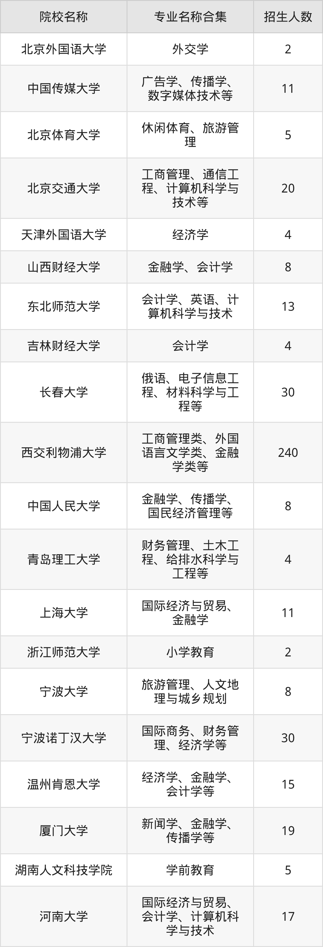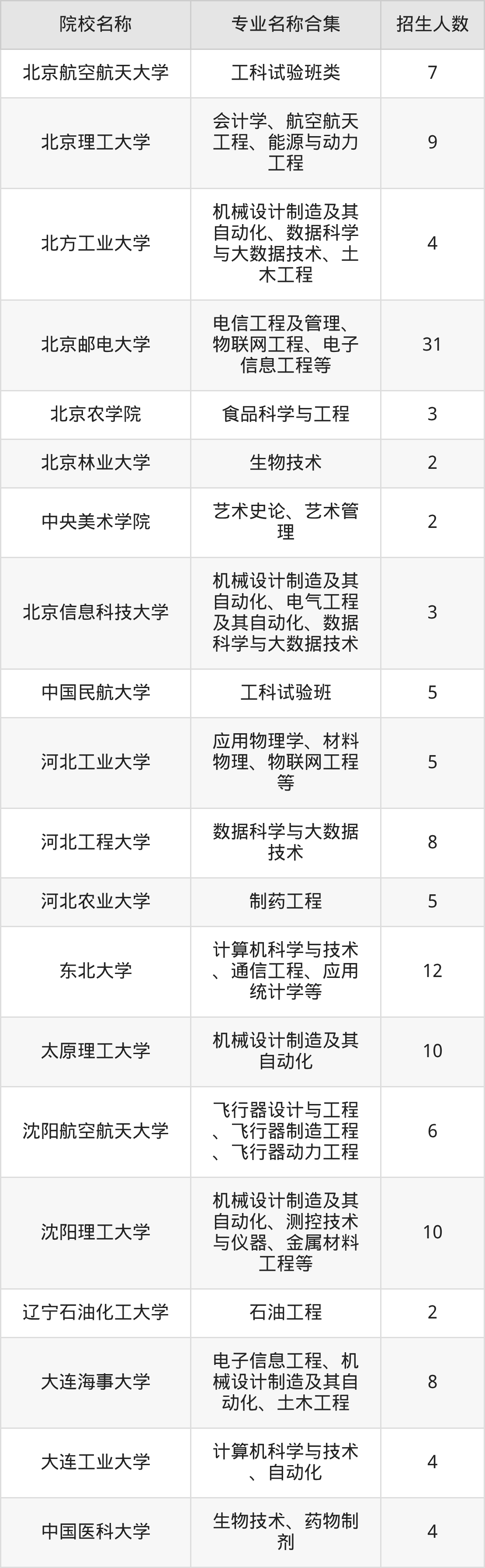 北京:北京外国语大学、中国传媒大学、北京体育大学、北京交通大学、中国人民大学、北京航空航天大学、北京理工大学、北方工业大学、北京邮电大学、北京农学院、北京林业大学、中央美术学院、北京信息科技大学