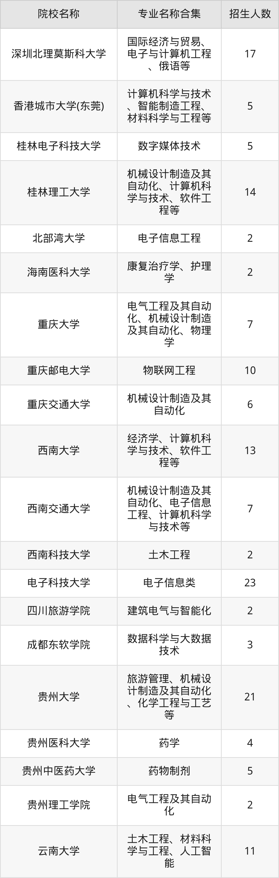 四川:成都理工大学、西南交通大学、西南科技大学、电子科技大学、四川旅游学院、成都东软学院