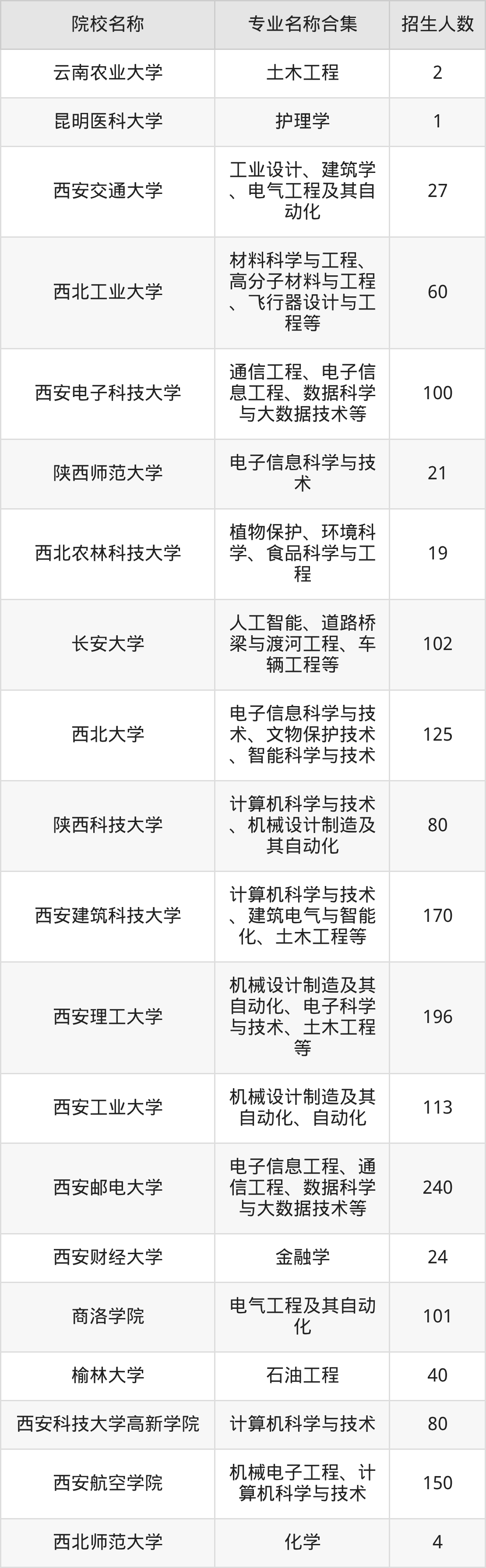 陕西:渭南师范学院、咸阳师范学院、西安铁路职业技术学院、陕西财经职业技术学院、陕西铁路工程职业技术学院、西安交通大学、西北工业大学、西安电子科技大学、陕西师范大学、西北农林科技大学、长安大学、西北大学、陕西科技大学、西安建筑科技大学、西安理工大学、西安工业大学、西安邮电大学、西安财经大学、商洛学院、榆林大学、西安科技大学高新学院、西安航空学院