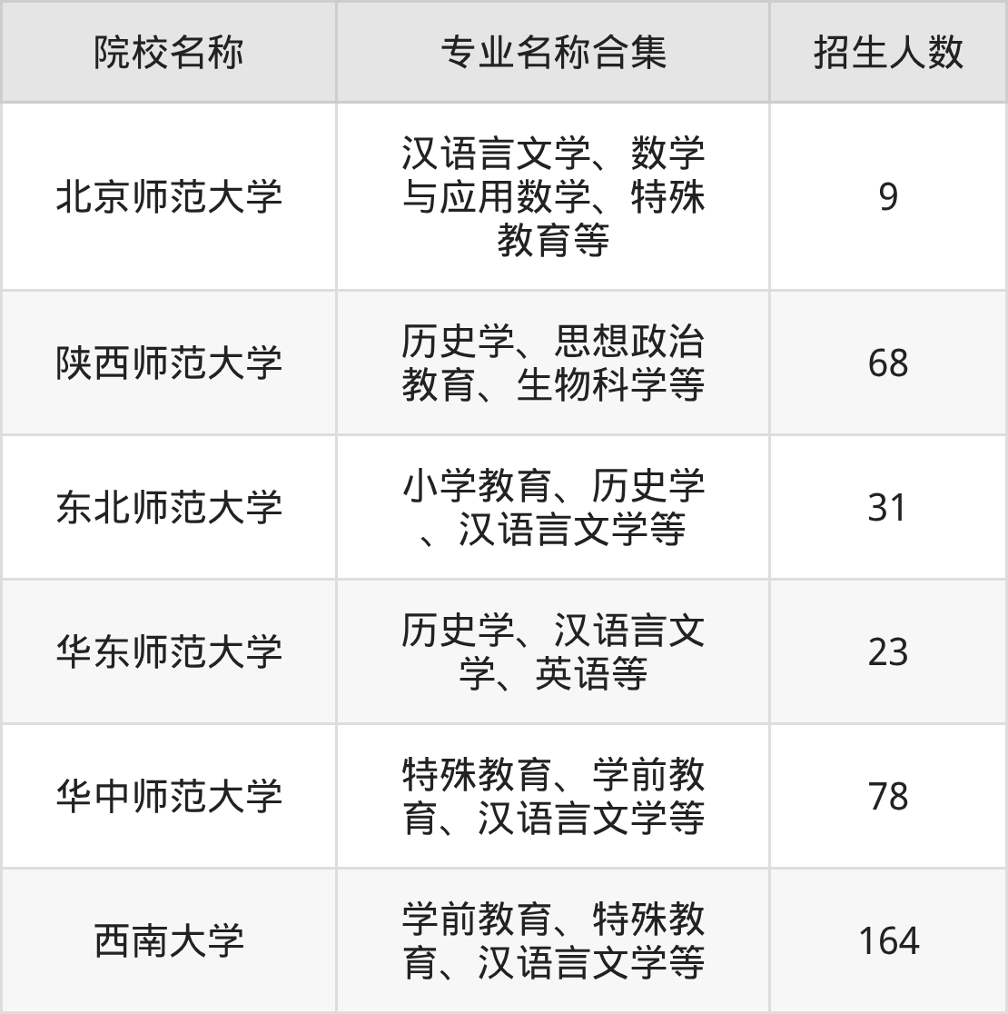 其中,西南大学以164人招生规模居首,华中师范大学78人紧随其后,陕西师范大学招68人,构成招生第一梯队。
