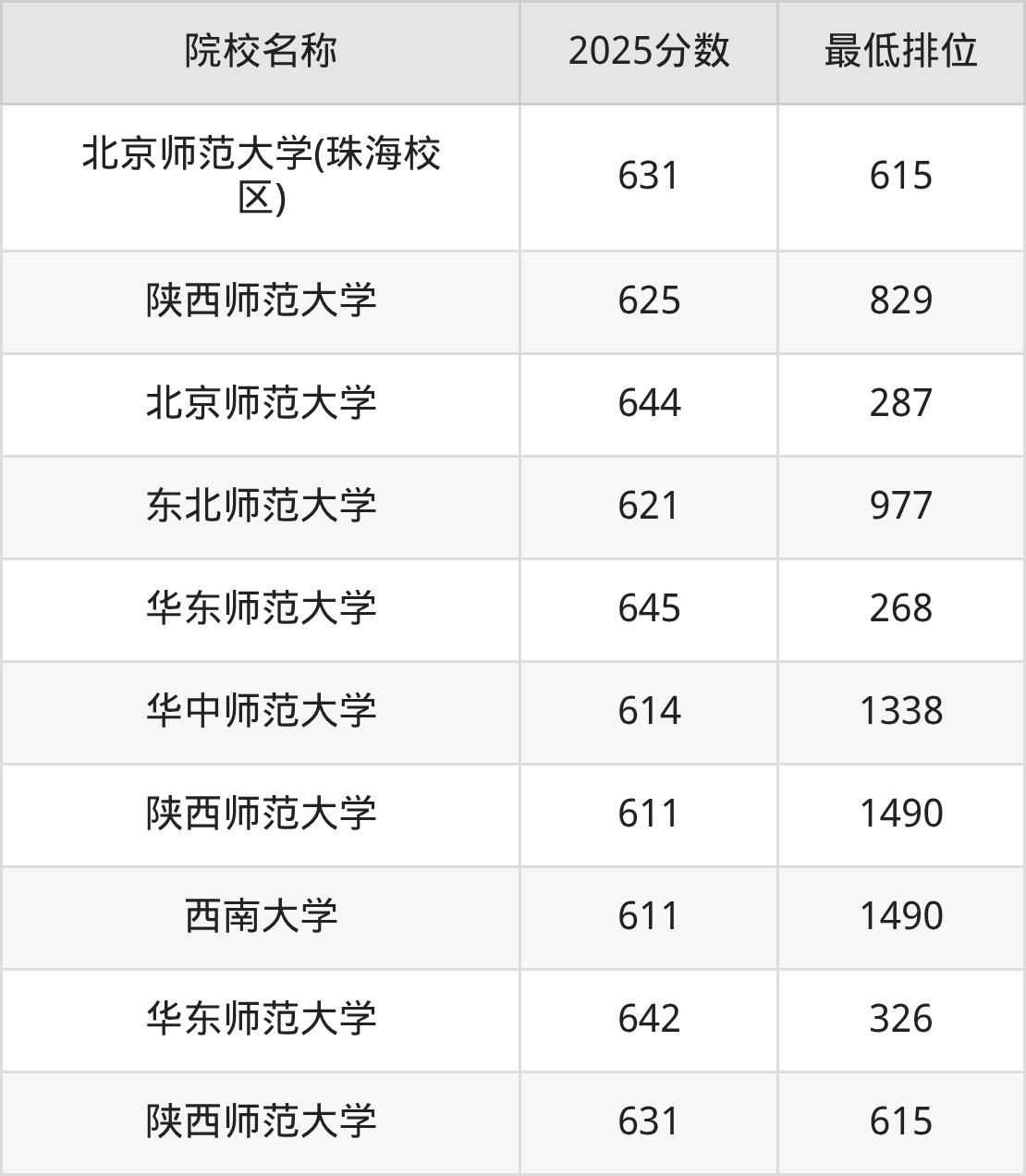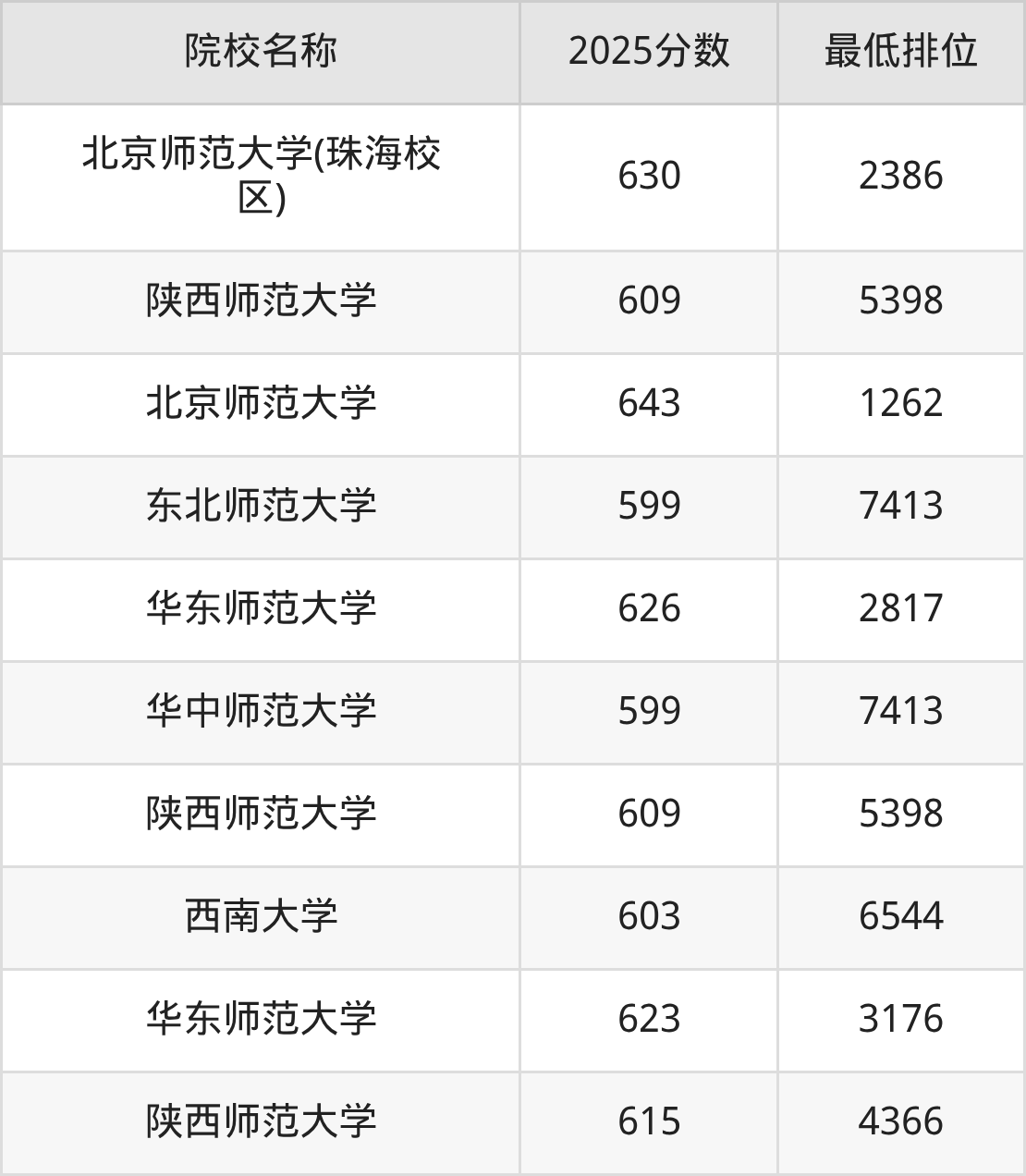 第三梯队(620分及以下):华中师范大学(614分)、陕西师范大学(611分)、西南大学(611分)