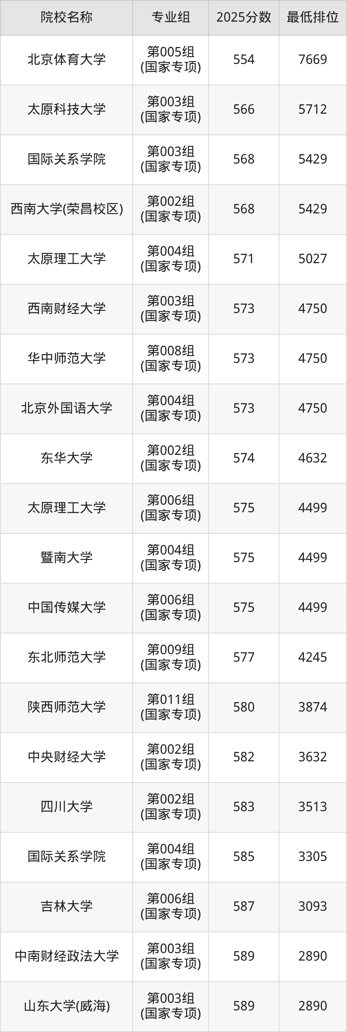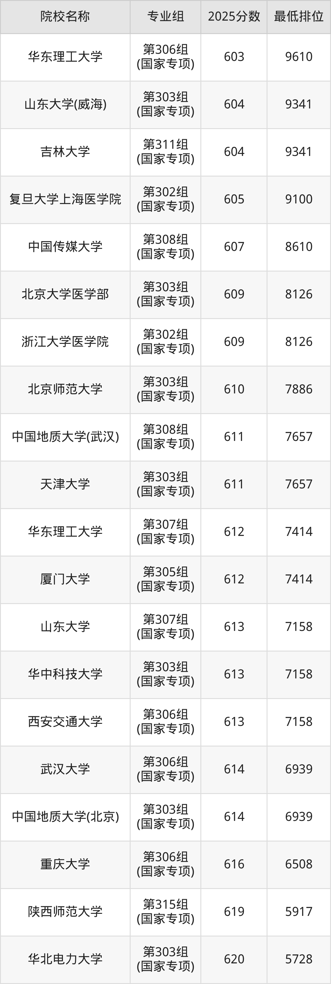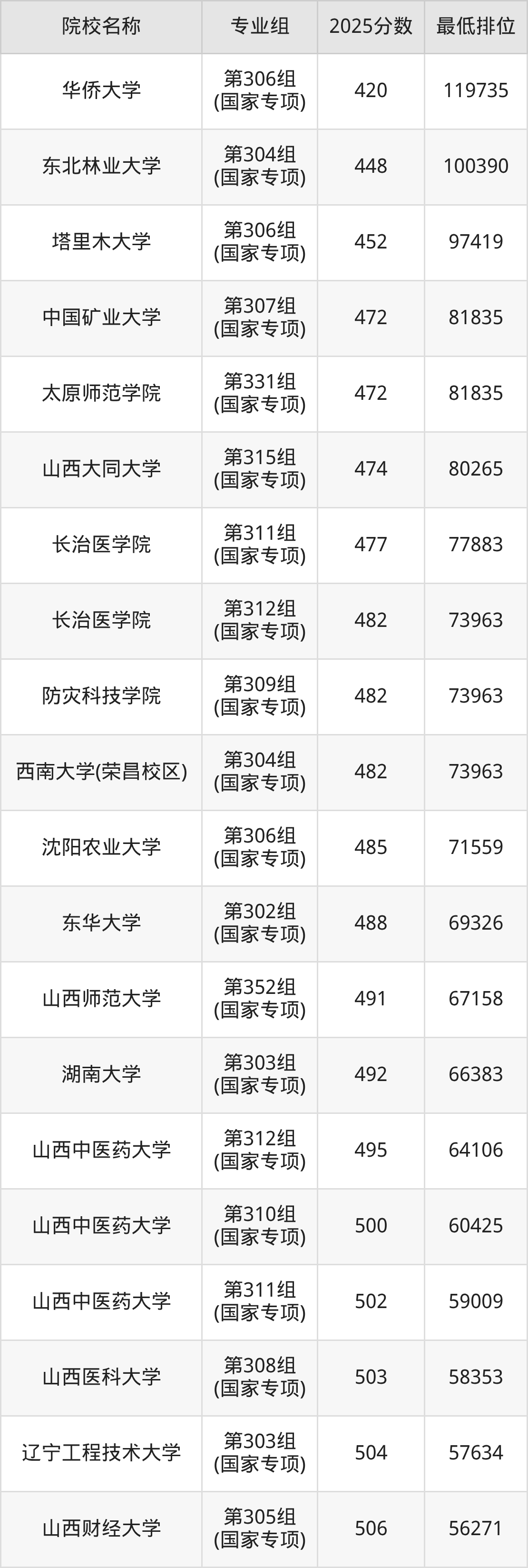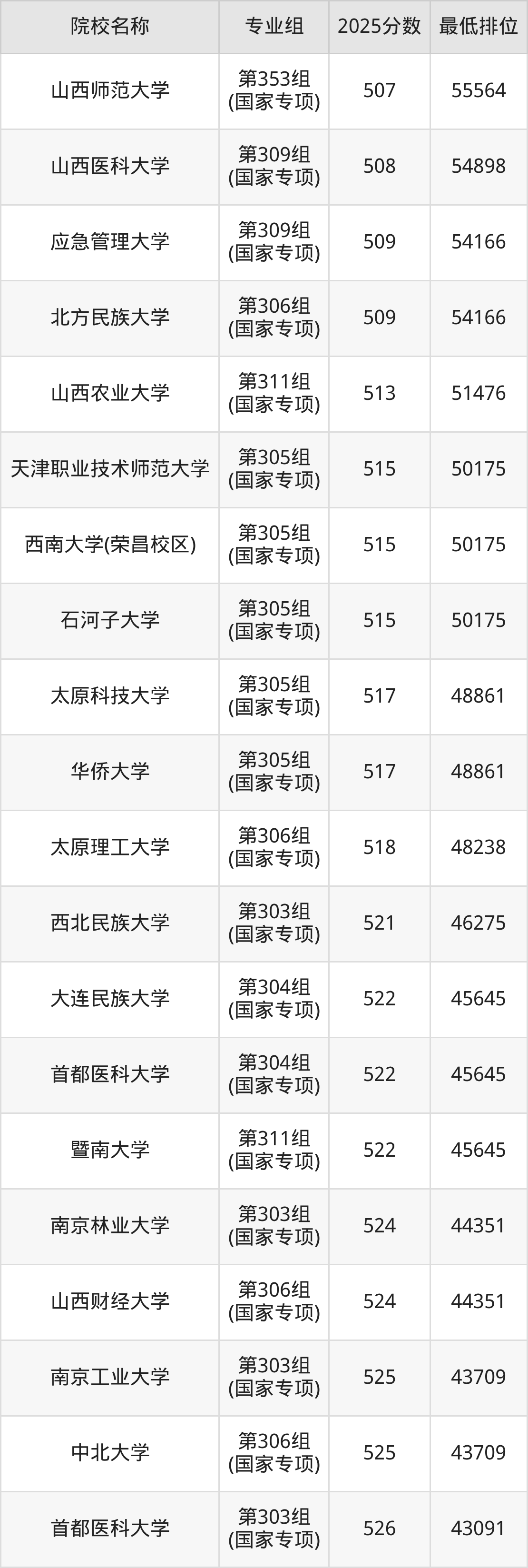 附国家专项计划院校2025年在山西高考物理类的录取分数线一览表: