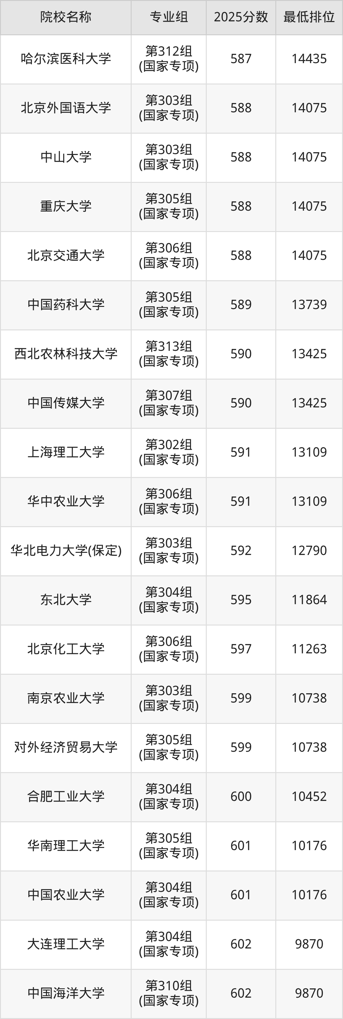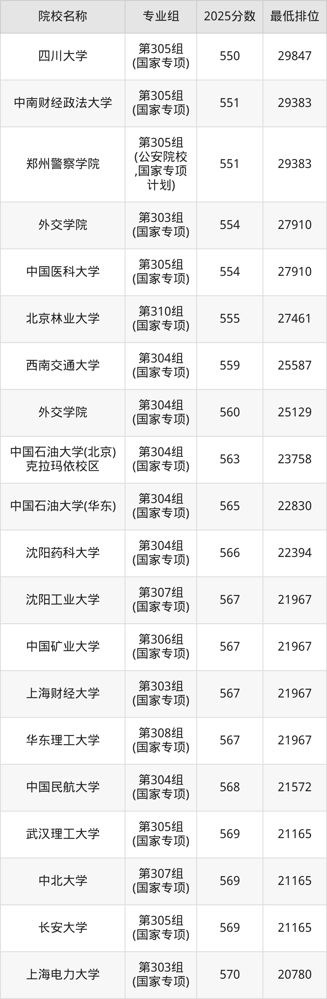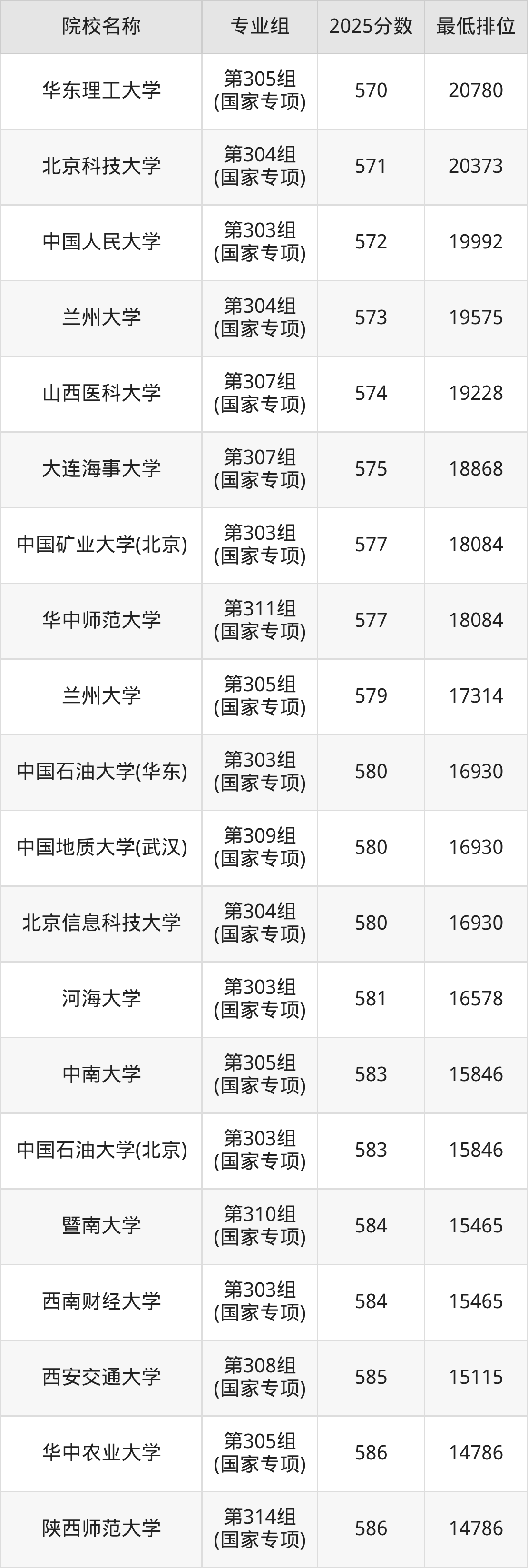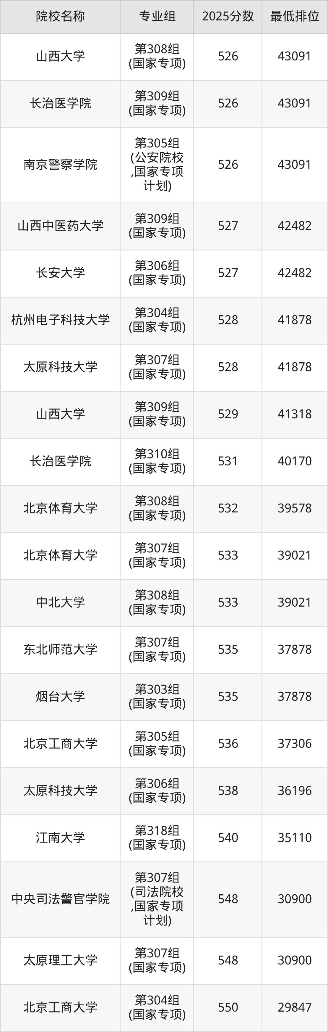 附国家专项计划院校2025年在山西高考物理类的录取分数线一览表: