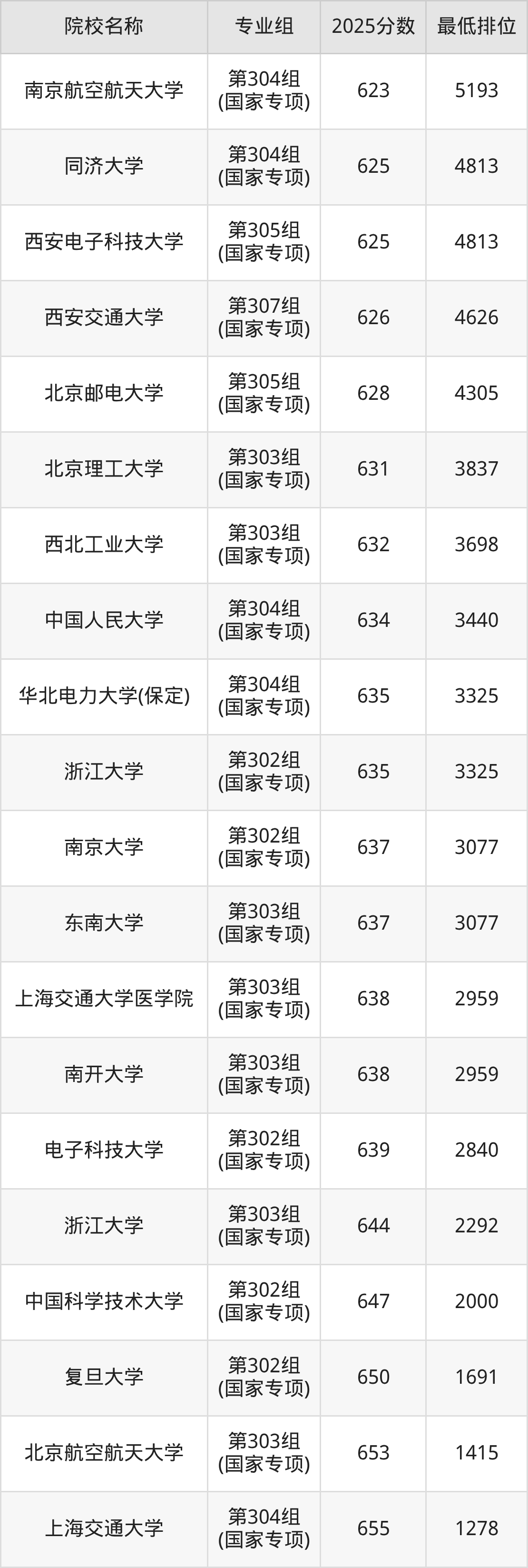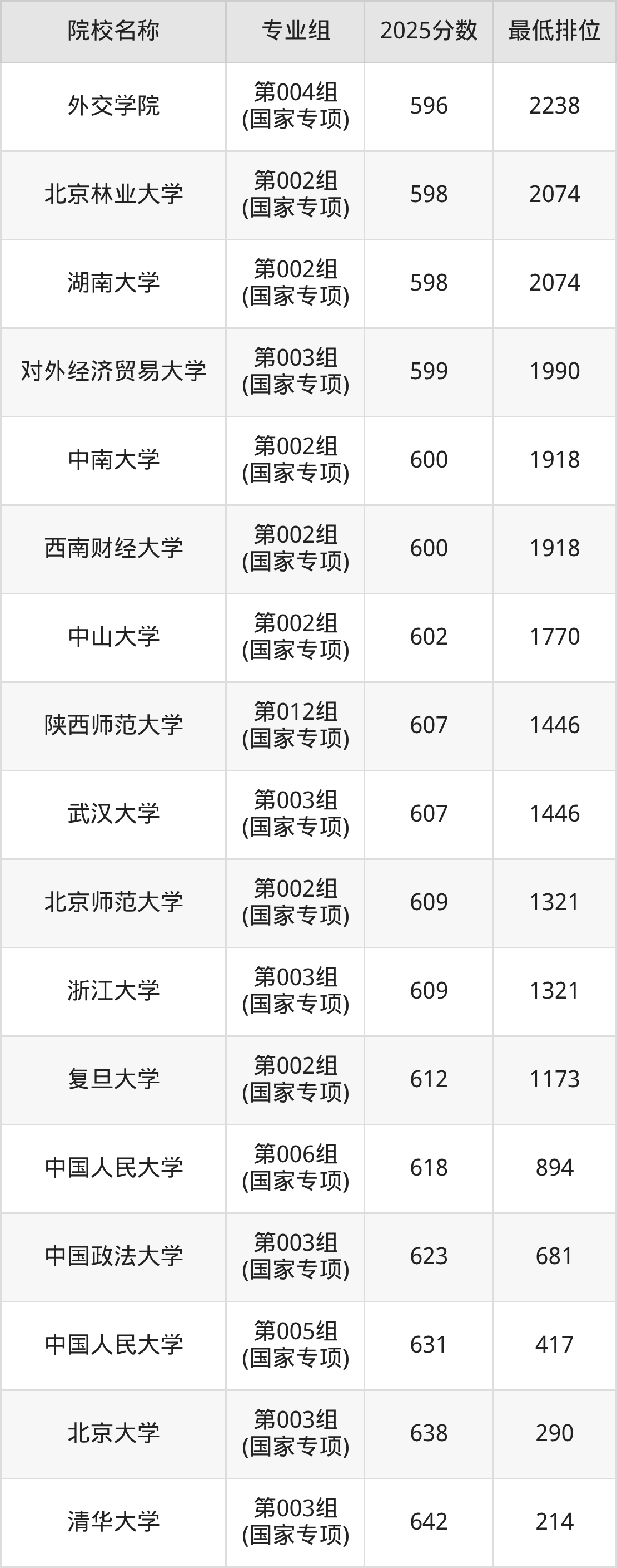 第一梯队(640分+):清华大学(第003组(国家专项)是642分)