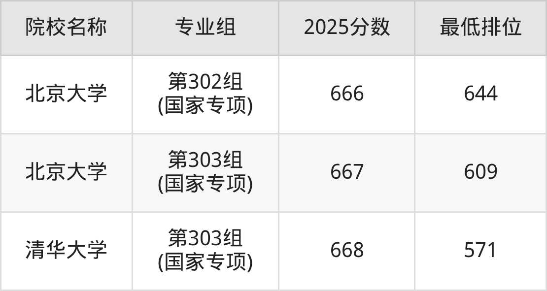第一梯队(660分+):北京大学(第302组(国家专项)是666分)、北京大学(第303组(国家专项)是667分)、清华大学(第303组(国家专项)是668分)