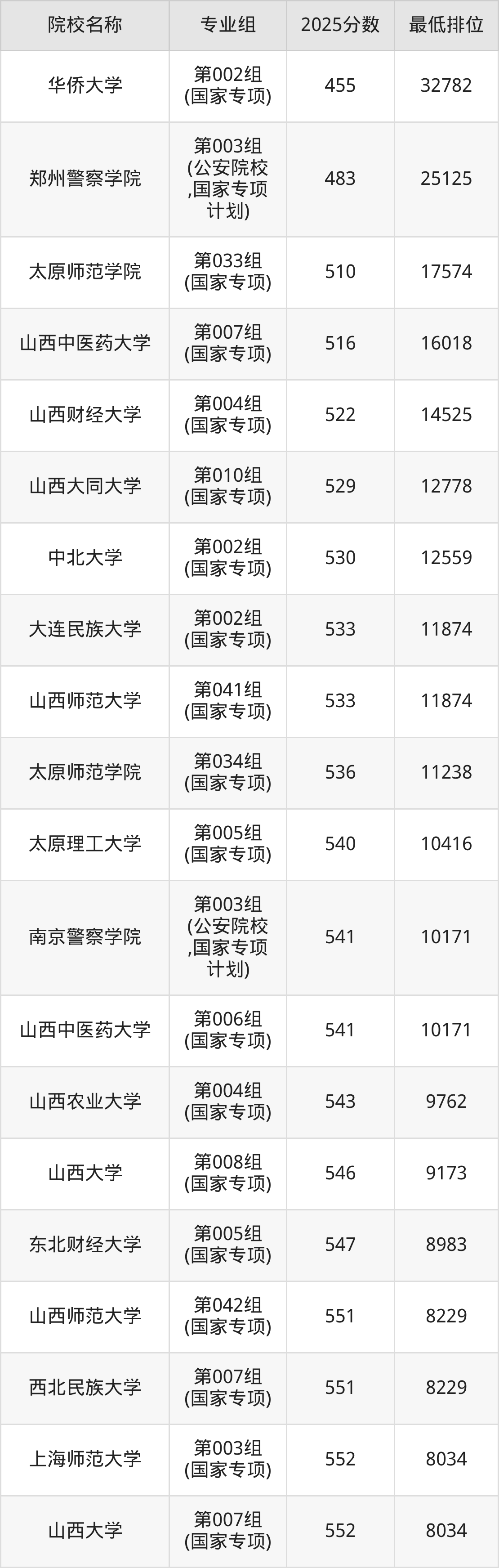 附国家专项计划院校2025年在山西高考历史类的录取分数线一览表: