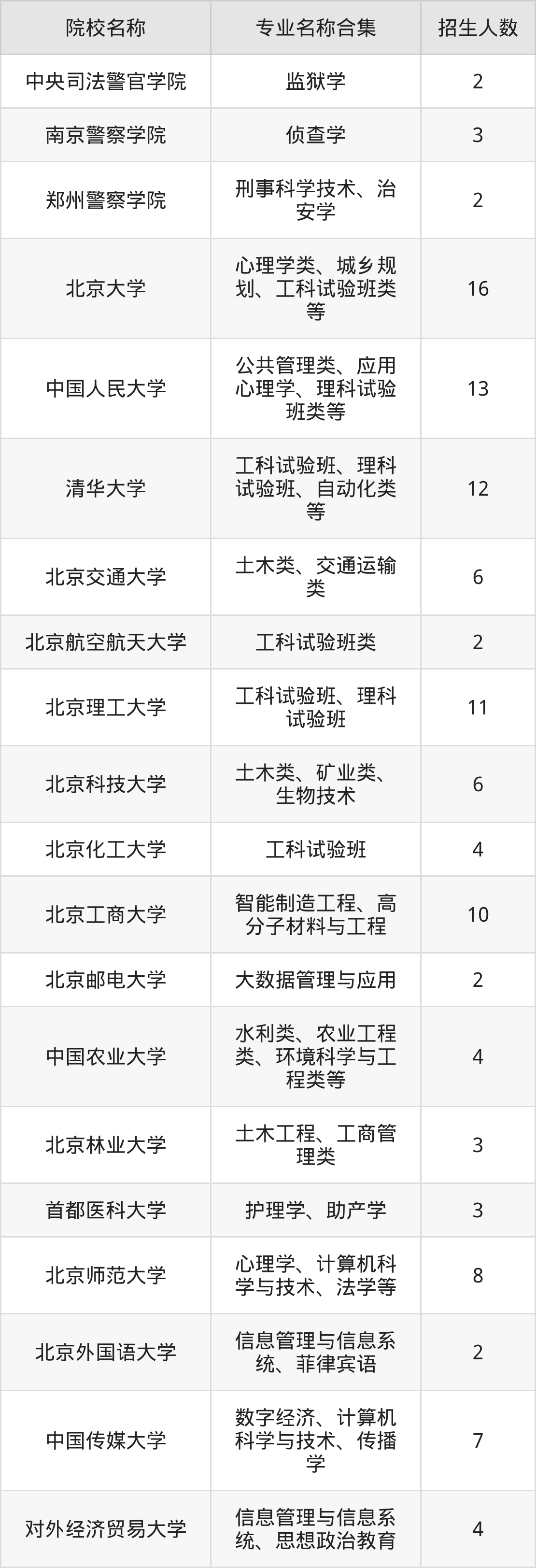 北京:北京大学、中国人民大学、清华大学、北京交通大学、北京航空航天大学、北京理工大学、北京科技大学、北京化工大学、北京工商大学、北京邮电大学、中国农业大学、北京林业大学、首都医科大学、北京师范大学、北京外国语大学、中国传媒大学、对外经济贸易大学、外交学院、北京体育大学、华北电力大学、北京信息科技大学、中国矿业大学(北京)、中国石油大学(北京)、中国地质大学(北京)、中央财经大学、国际关系学院、中国政法大学