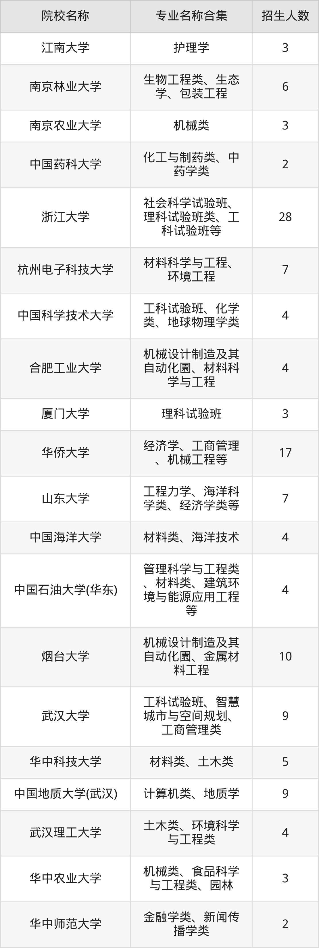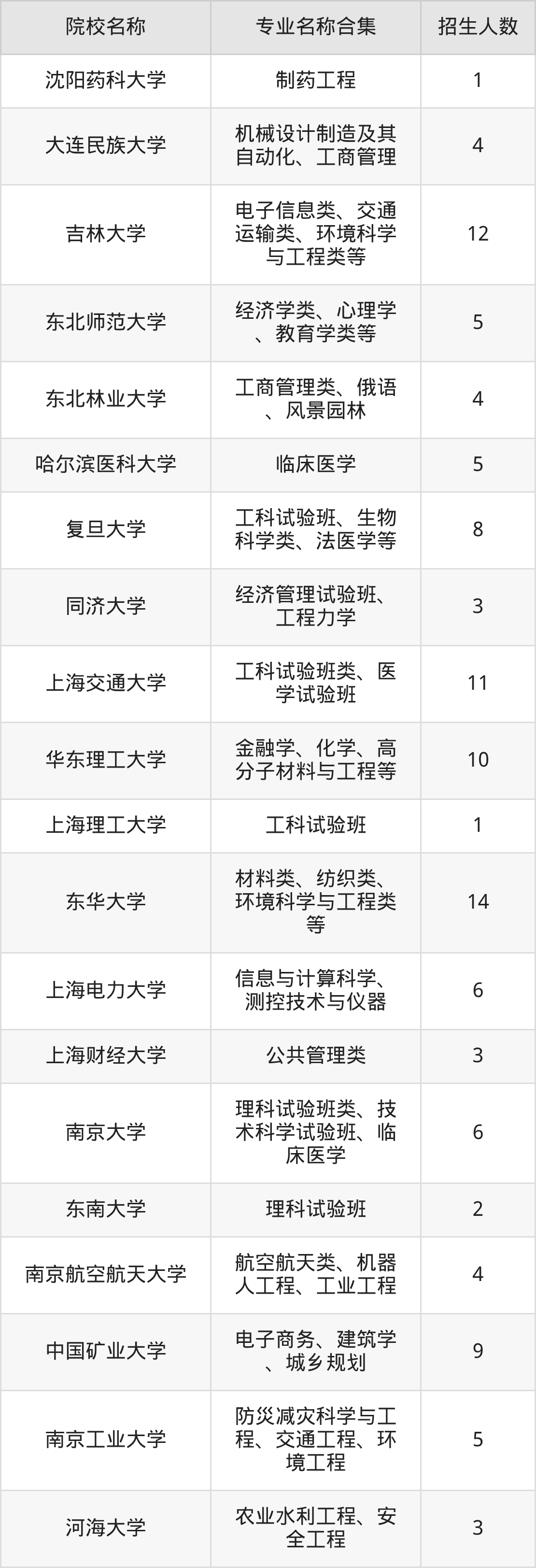 江苏:南京警察学院、南京大学、东南大学、南京航空航天大学、中国矿业大学、南京工业大学、河海大学、江南大学、南京林业大学、南京农业大学、中国药科大学
