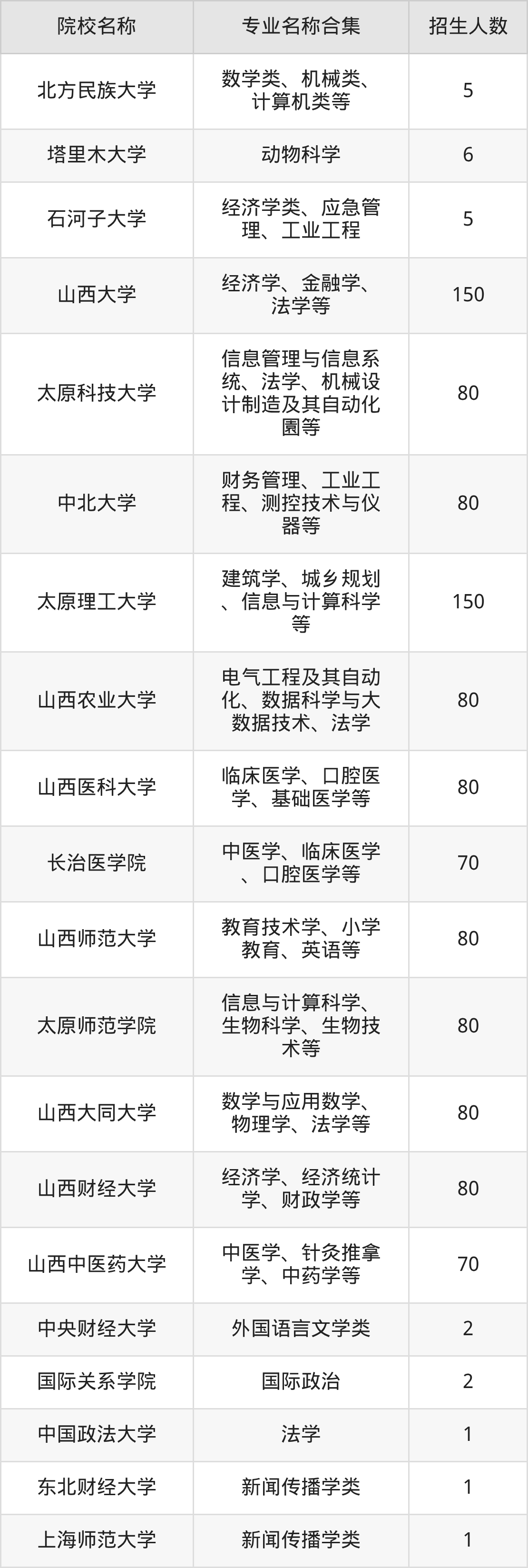 其中,山西大学、太原理工大学分别以150人招生规模居首,山西农业大学、中北大学、山西医科大学、太原师范学院、山西大同大学、太原科技大学、山西师范大学、山西财经大学分别以80人紧随其后,山西中医药大学、长治医学院各招70人,构成招生第一梯队。
