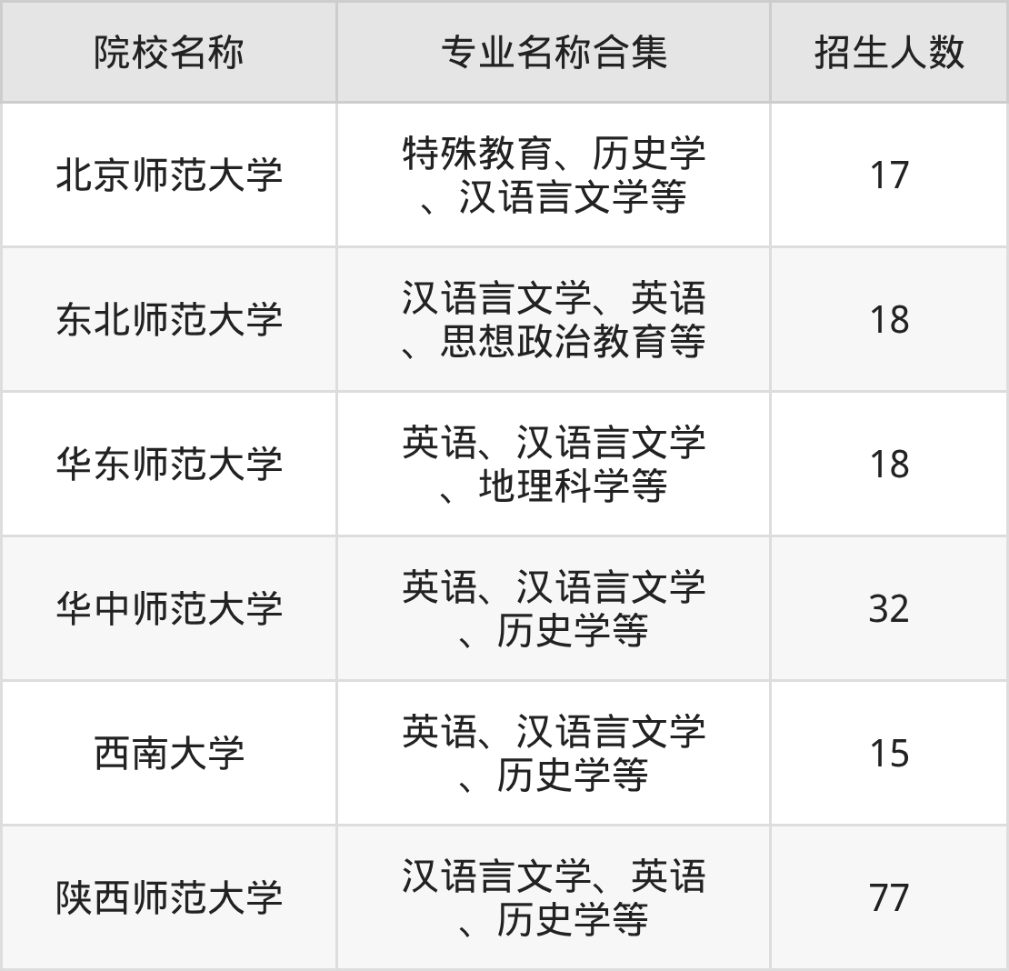其中,陕西师范大学以77人招生规模居首,华中师范大学32人紧随其后,东北师范大学、华东师范大学各招18人,构成招生第一梯队。