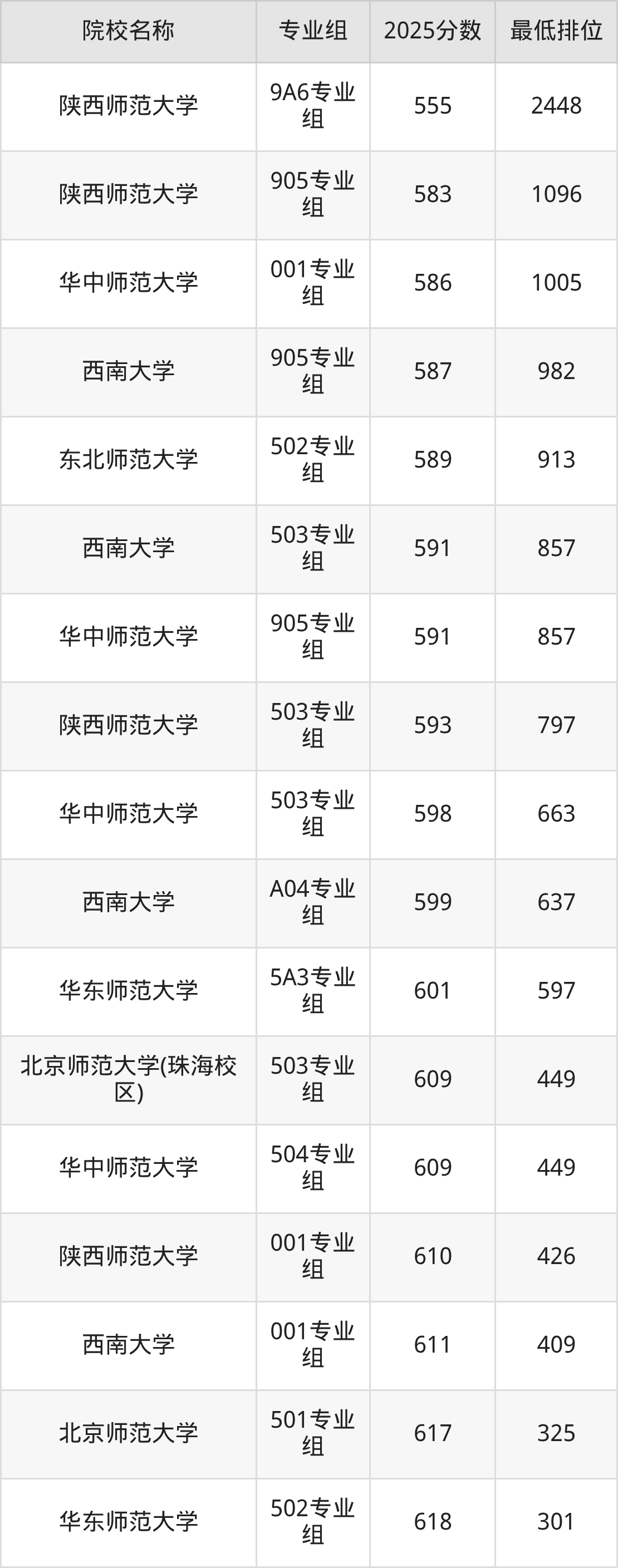 第二梯队(561-609分):陕西师范大学(905专业组是583分)、华中师范大学(001专业组是586分)、西南大学(905专业组是587分)、东北师范大学(502专业组是589分)