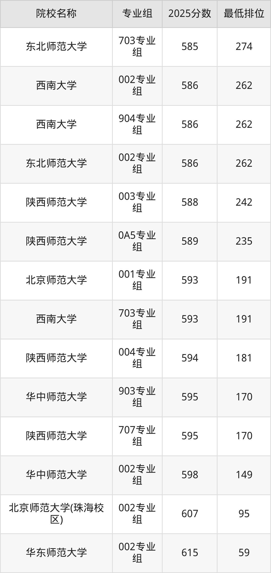 第三梯队(590分及以下):东北师范大学(703专业组是585分)、西南大学(002专业组是586分)、西南大学(904专业组是586分)、东北师范大学(002专业组是586分)