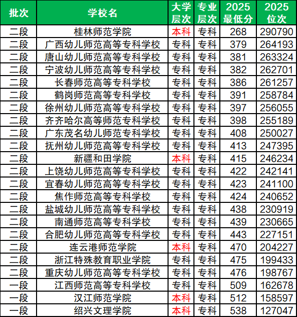 2025年师范类大学专科录取分数线范围在268分-538分之间,分数线排名最高的院校是师范类本科院校——绍兴文理学院,2025年专科最低分为538分(超一段线48分录取)、对应最低位次127047名。分数线排名最低的院校是桂林师范学院(同样是本科院校),2025年专科最低分均为268分(压专科线录取)、对应最低位次290790名。