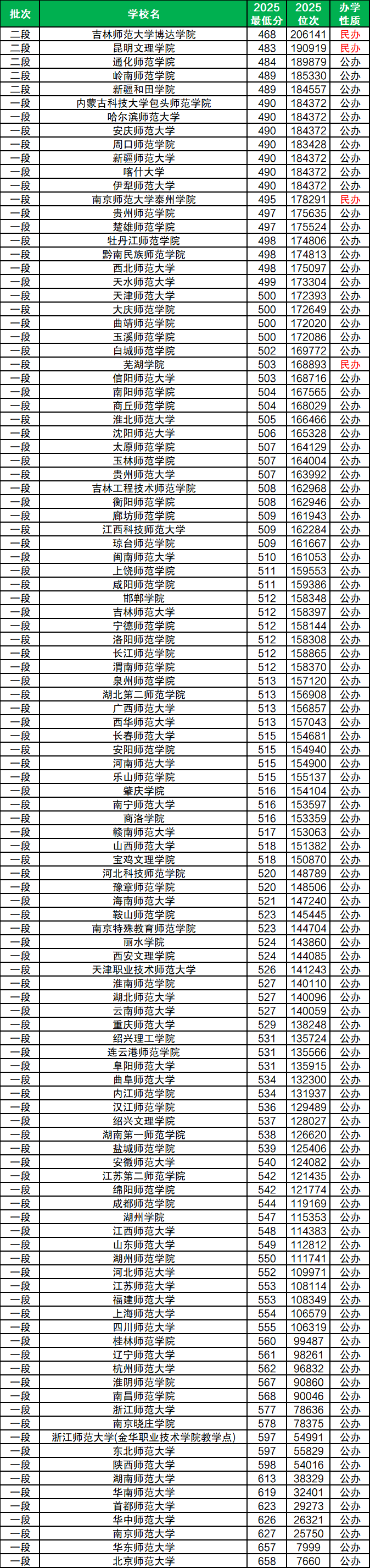 以浙江高考招录数据为例,2025年全国师范类大学录取分数线为:本科468分-658分,专科268分-538分。更多院校排名及分数线详情在下文查阅。
