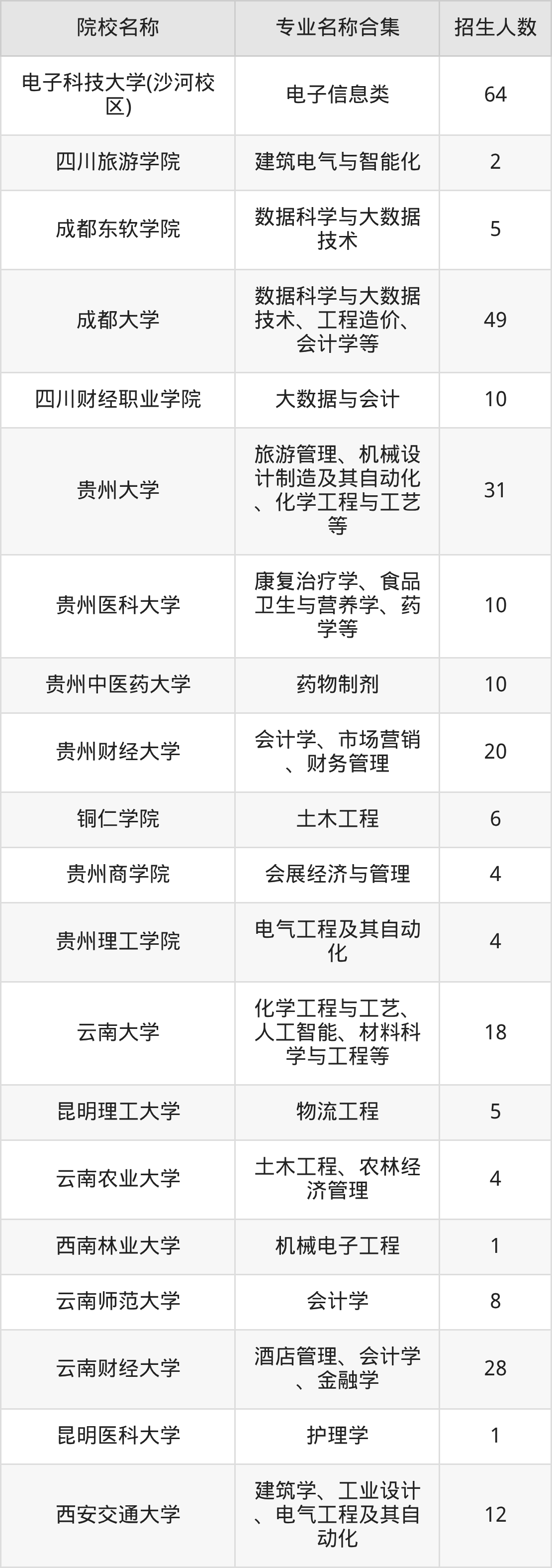 四川:西南交通大学、成都理工大学、西南科技大学、四川农业大学、西南医科大学、成都中医药大学、四川师范大学、西南财经大学、成都体育学院、电子科技大学(沙河校区)、四川旅游学院、成都东软学院、成都大学、四川财经职业学院、四川音乐学院