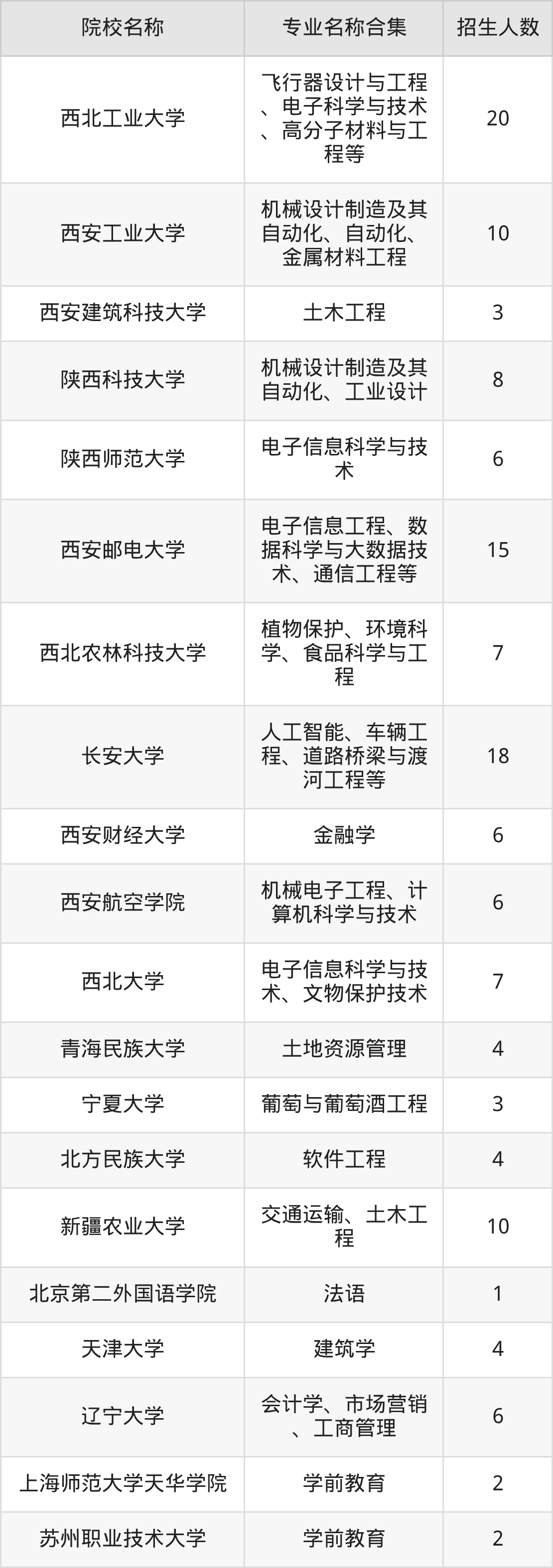 陕西:西安交通大学、西北工业大学、西安工业大学、西安建筑科技大学、陕西科技大学、陕西师范大学、西安邮电大学、西北农林科技大学、长安大学、西安财经大学、西安航空学院、西北大学、渭南师范学院、咸阳师范学院
