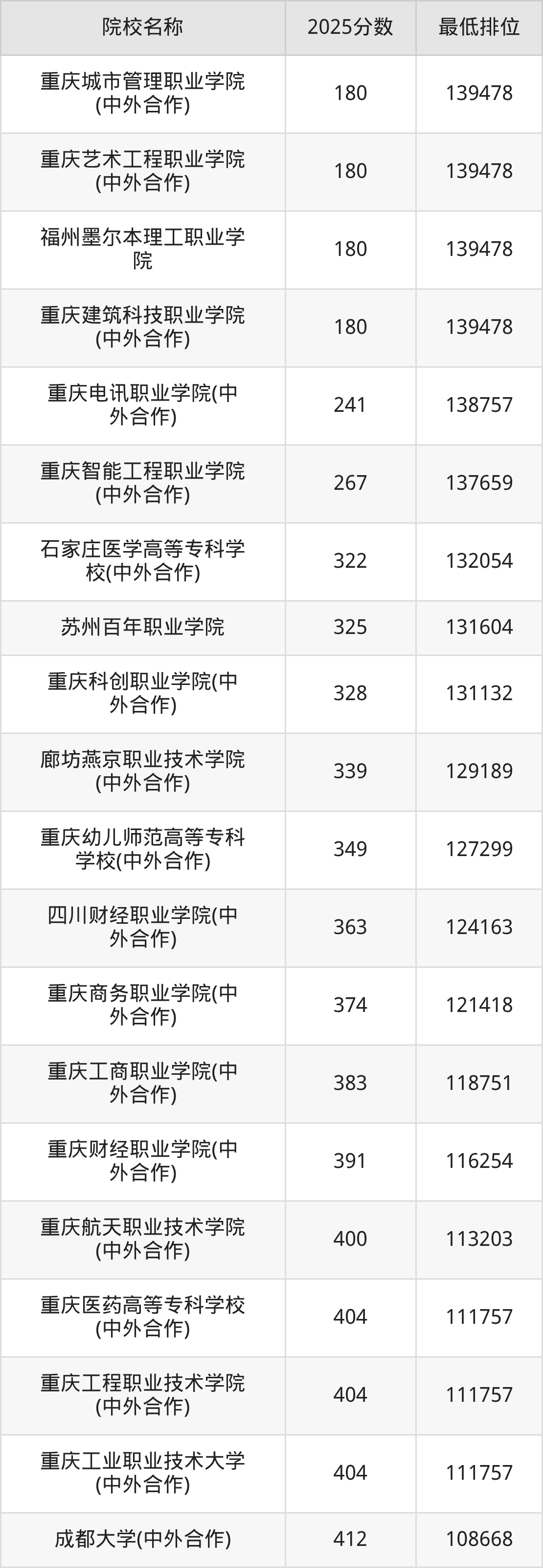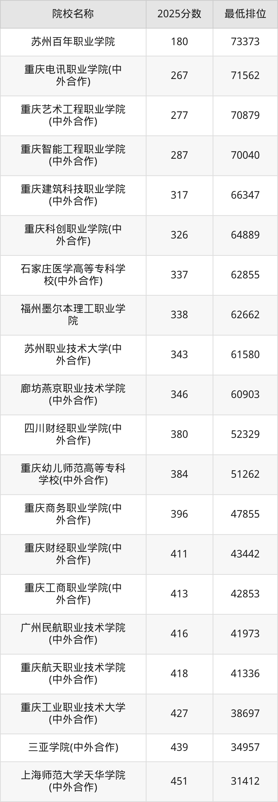 第三梯队(190分及以下):重庆城市管理职业学院(中外合作)(180分)、重庆艺术工程职业学院(中外合作)(180分)、福州墨尔本理工职业学院(180分)、重庆建筑科技职业学院(中外合作)(180分)