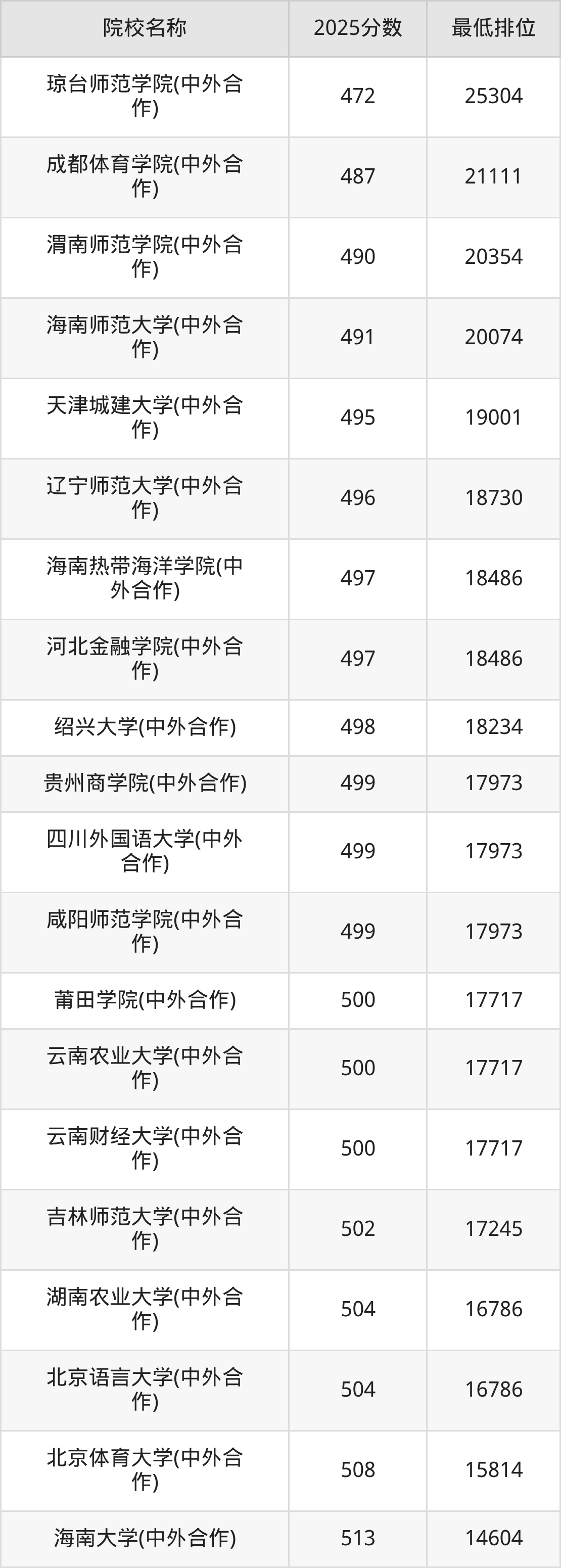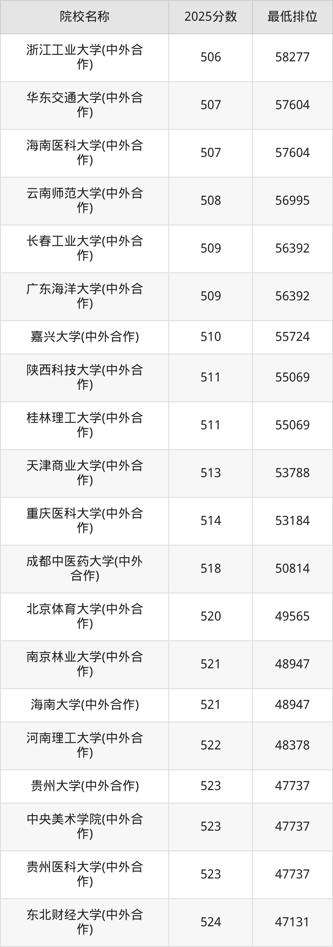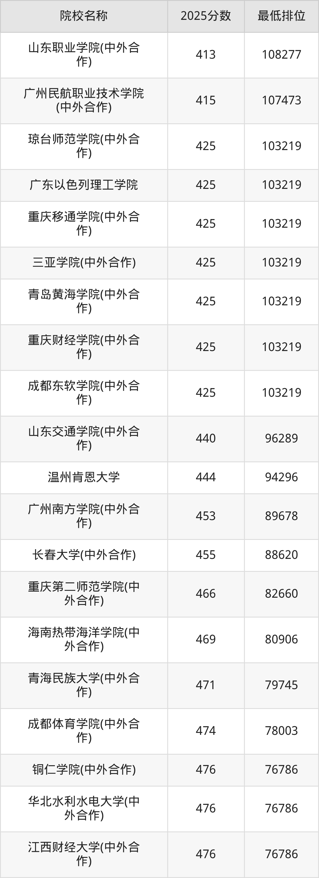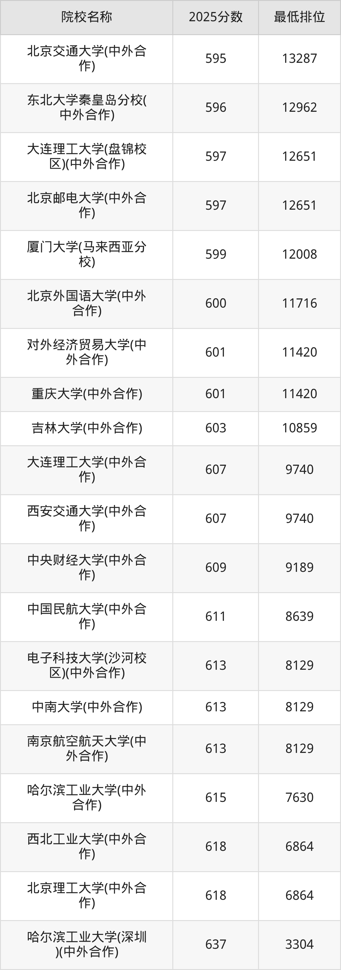 2025年在重庆高考共计223所中外合作办学院校招生,市外高校有198所、市内高校有28所,包含重庆大学、重庆邮电大学、重庆交通大学等。再看重庆中外合作办学大学2025年录取分数线,物理类最低分区间是180至651分,历史类最低分区间是180至603分,2026届有意报考的同学请参考!