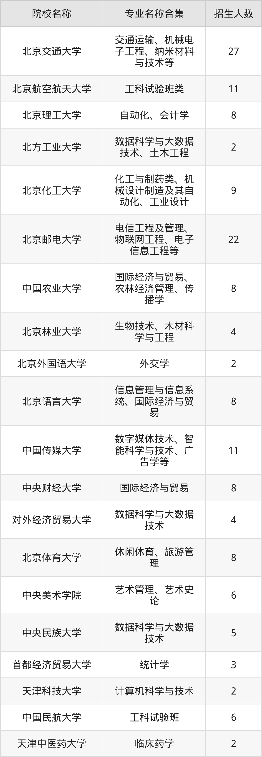 北京:北京交通大学、北京航空航天大学、北京理工大学、北方工业大学、北京化工大学、北京邮电大学、中国农业大学、北京林业大学、北京外国语大学、北京语言大学、中国传媒大学、中央财经大学、对外经济贸易大学、北京体育大学、中央美术学院、中央民族大学、首都经济贸易大学、中国人民大学、北京第二外国语学院