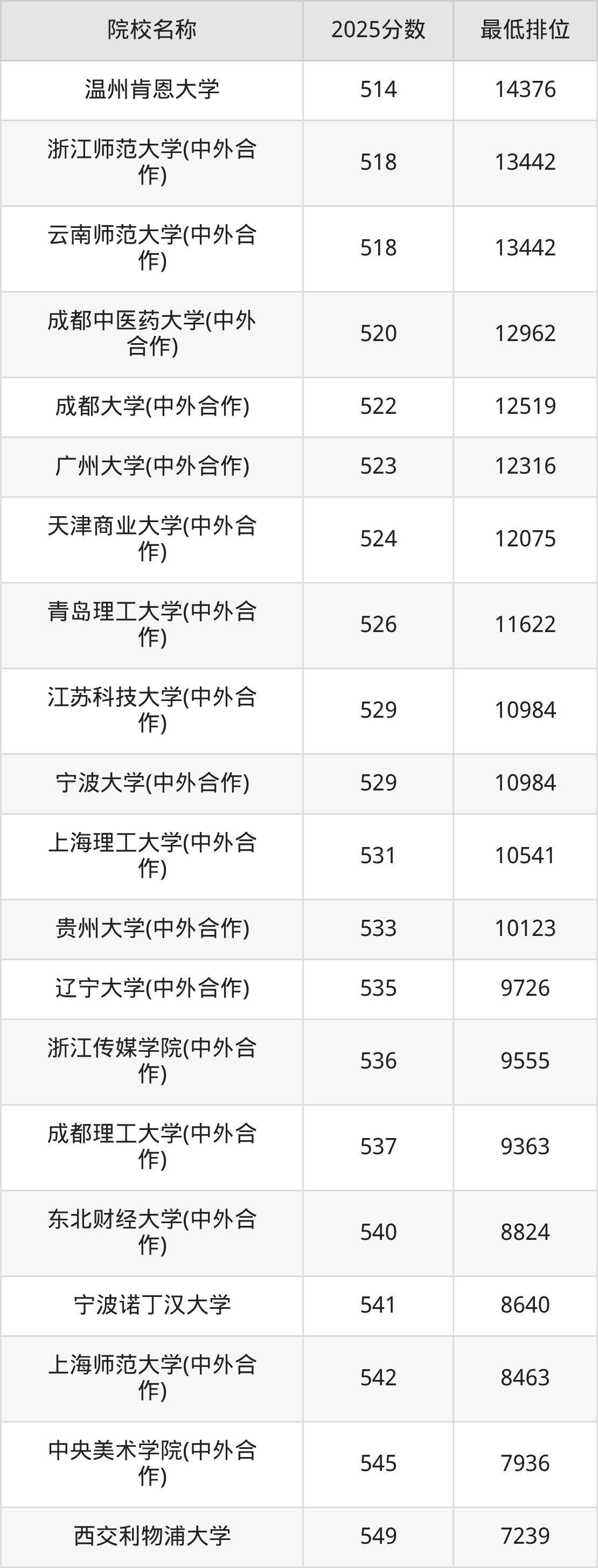 附中外合作办学院校2025年在重庆高考物理类的录取分数线一览表: