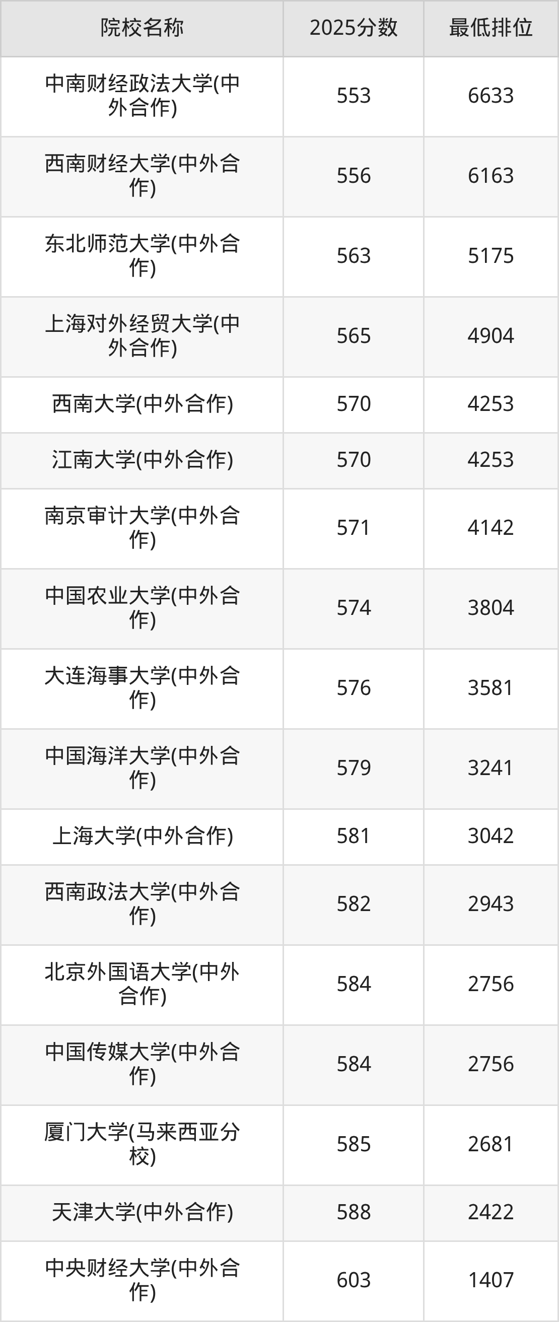 第一梯队(600分+):中央财经大学(中外合作)(603分)