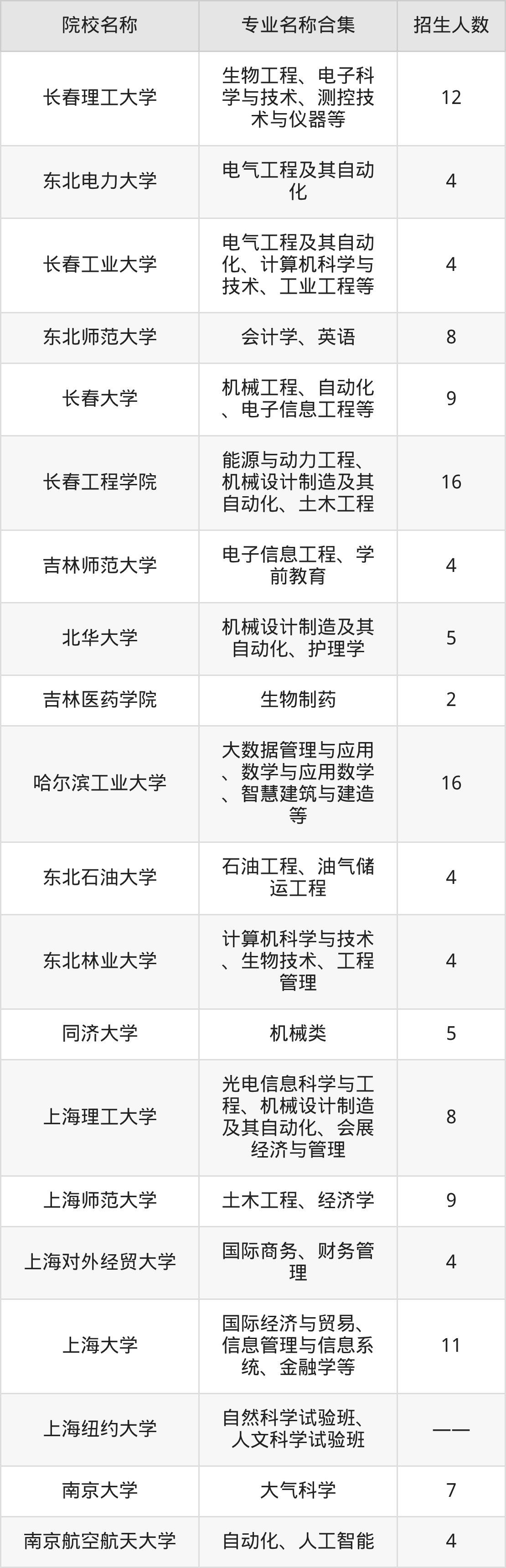 吉林:吉林大学、长春理工大学、东北电力大学、长春工业大学、东北师范大学、长春大学、长春工程学院、吉林师范大学、北华大学、吉林医药学院