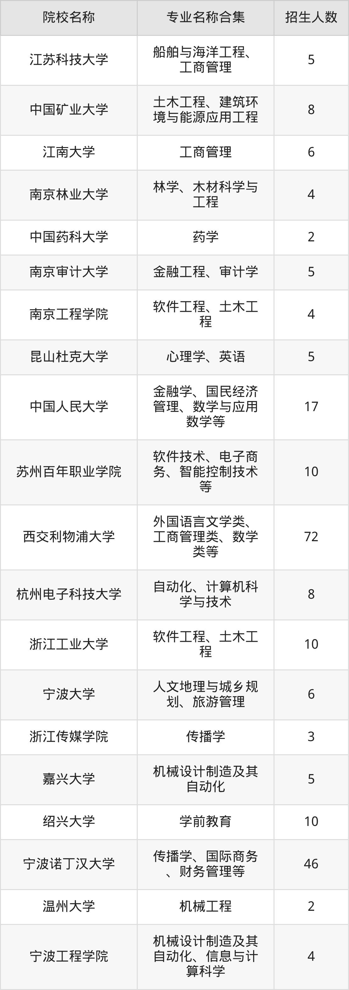 江苏:南京大学、南京航空航天大学、江苏科技大学、中国矿业大学、江南大学、南京林业大学、中国药科大学、南京审计大学、南京工程学院、昆山杜克大学、苏州百年职业学院、西交利物浦大学、苏州职业技术大学
