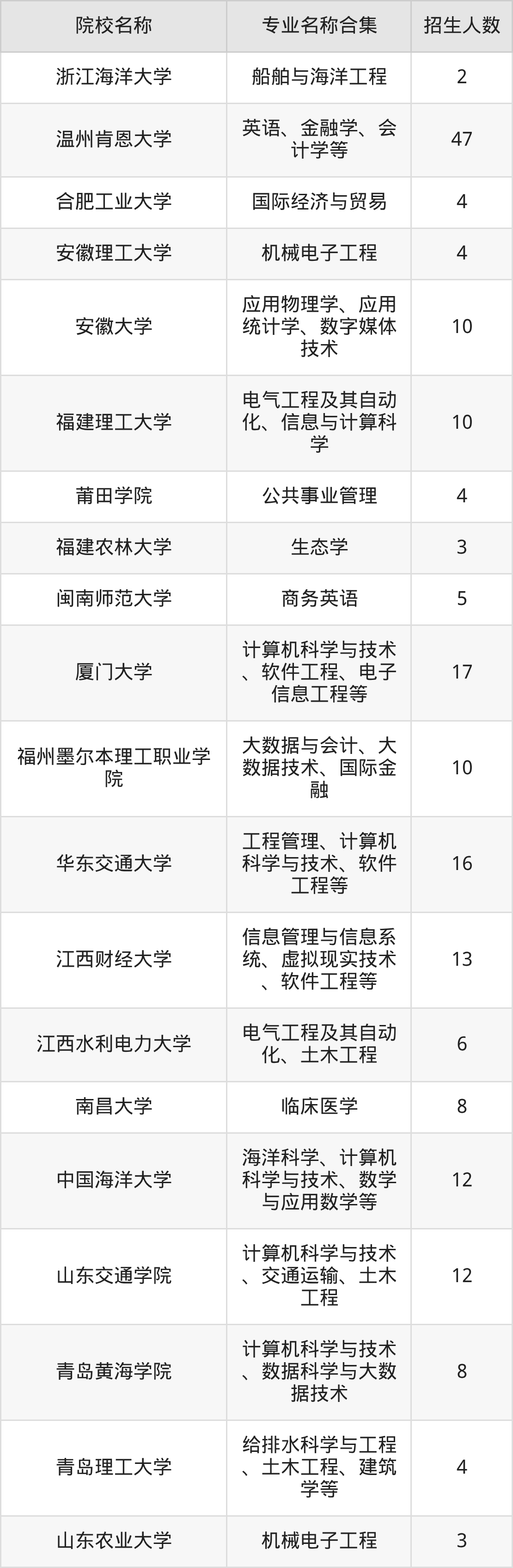 山东:中国海洋大学、山东交通学院、青岛黄海学院、青岛理工大学、山东农业大学、鲁东大学、山东职业学院