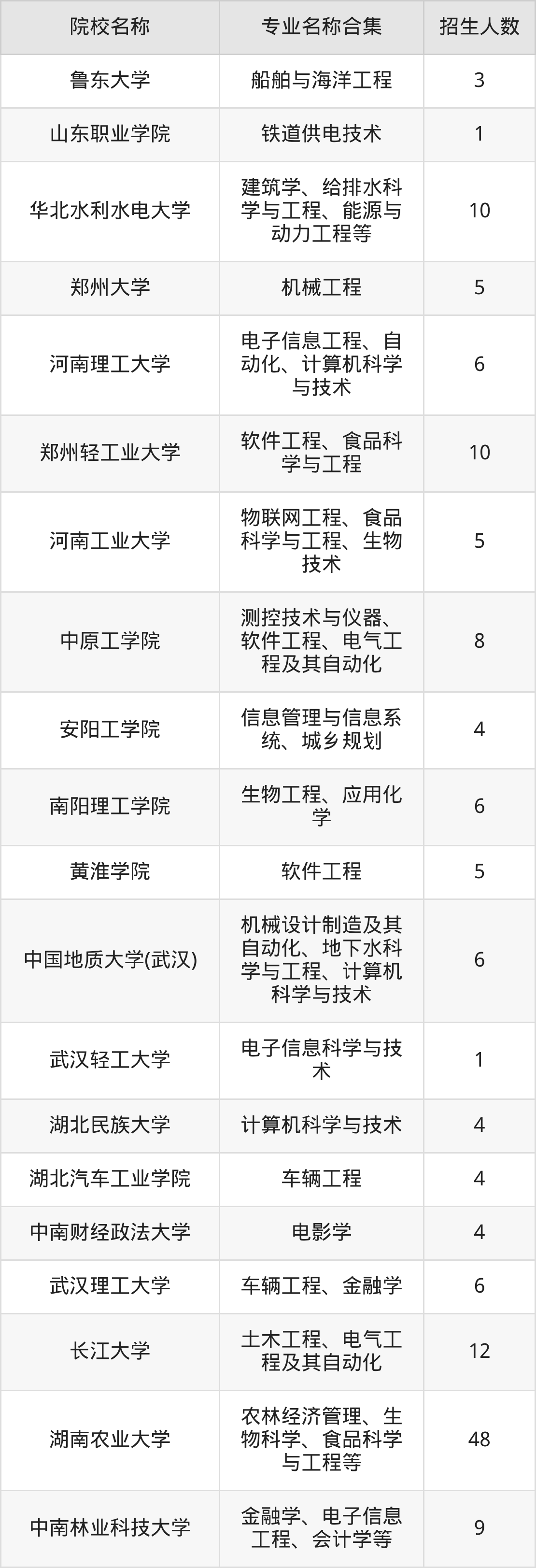 河南:华北水利水电大学、郑州大学、河南理工大学、郑州轻工业大学、河南工业大学、中原工学院、安阳工学院、南阳理工学院、黄淮学院