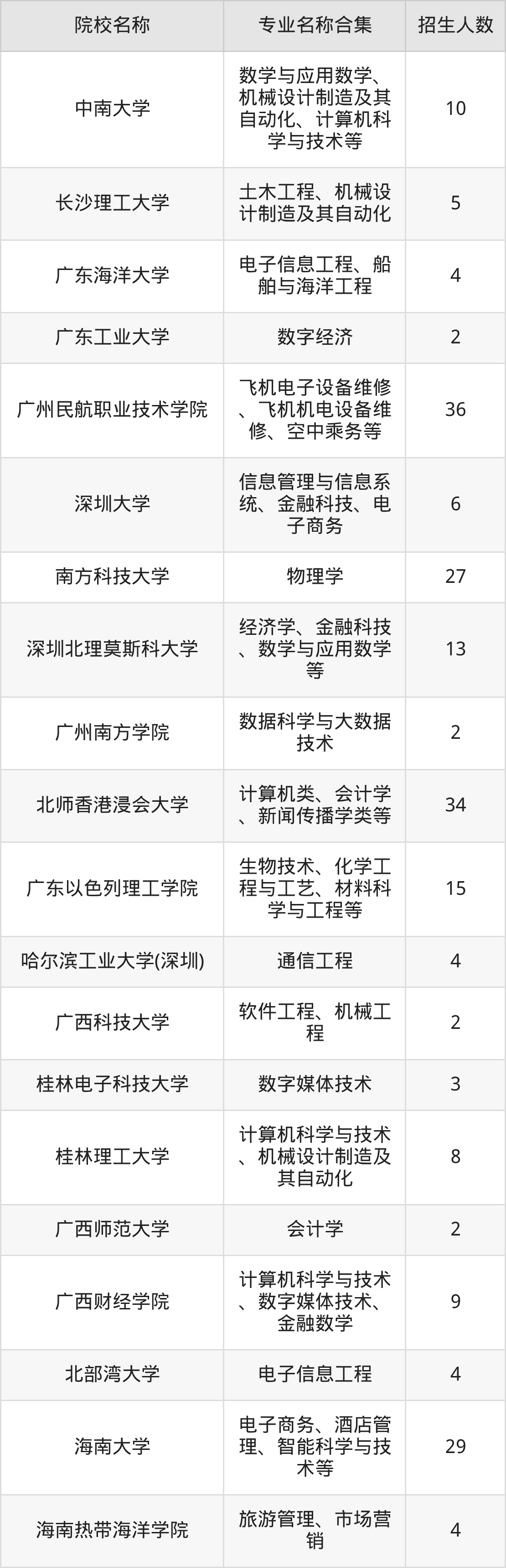 广东:广东海洋大学、广东工业大学、广州民航职业技术学院、深圳大学、南方科技大学、深圳北理莫斯科大学、广州南方学院、北师香港浸会大学、广东以色列理工学院、哈尔滨工业大学(深圳)、广州大学