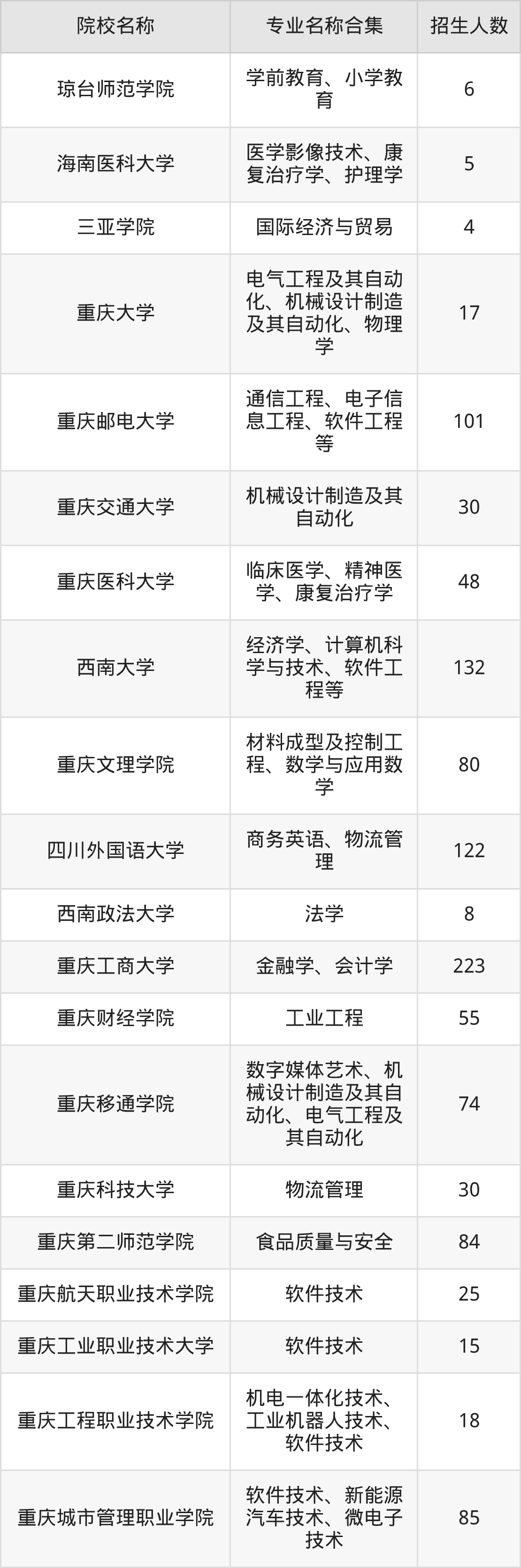 其中,重庆工商大学以223人招生规模居首,西南大学132人紧随其后,四川外国语大学招122人,构成招生第一梯队。