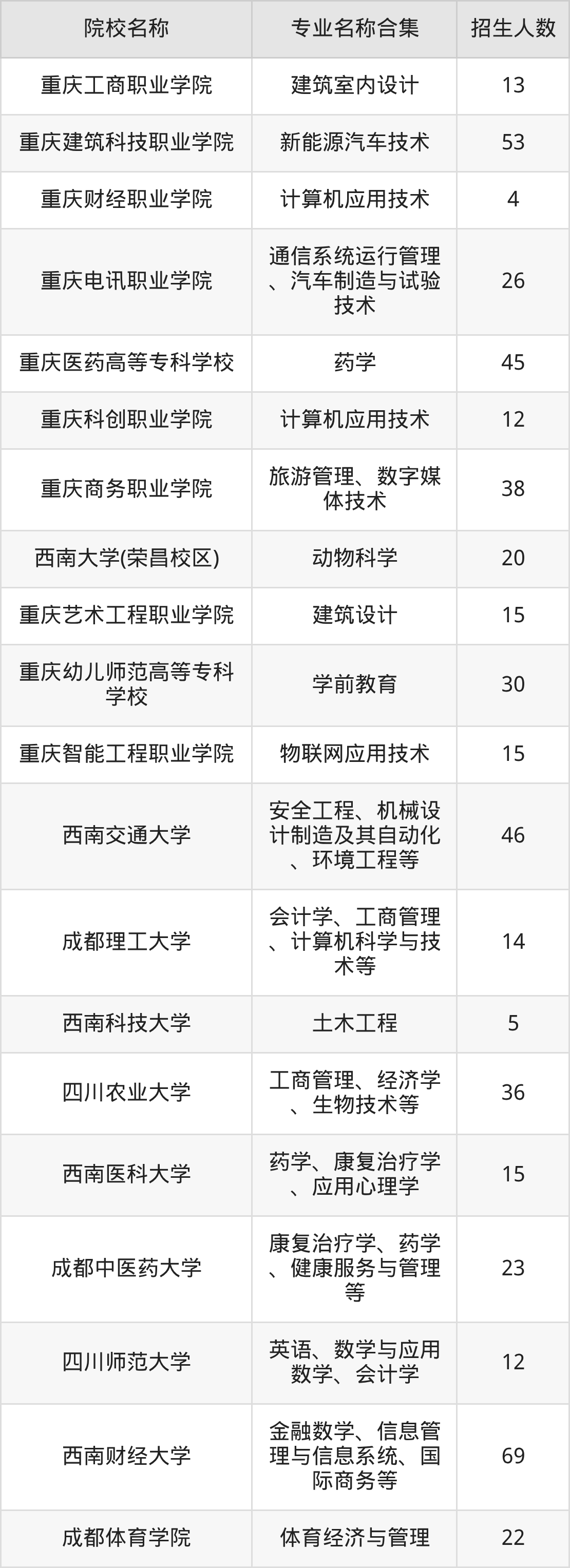 重庆:重庆大学、重庆邮电大学、重庆交通大学、重庆医科大学、西南大学、重庆文理学院、四川外国语大学、西南政法大学、重庆工商大学、重庆财经学院、重庆移通学院、重庆科技大学、重庆第二师范学院、重庆航天职业技术学院、重庆工业职业技术大学、重庆工程职业技术学院、重庆城市管理职业学院、重庆工商职业学院、重庆建筑科技职业学院、重庆财经职业学院、重庆电讯职业学院、重庆医药高等专科学校、重庆科创职业学院、重庆商务职业学院、西南大学(荣昌校区)、重庆艺术工程职业学院、重庆幼儿师范高等专科学校、重庆智能工程职业学院
