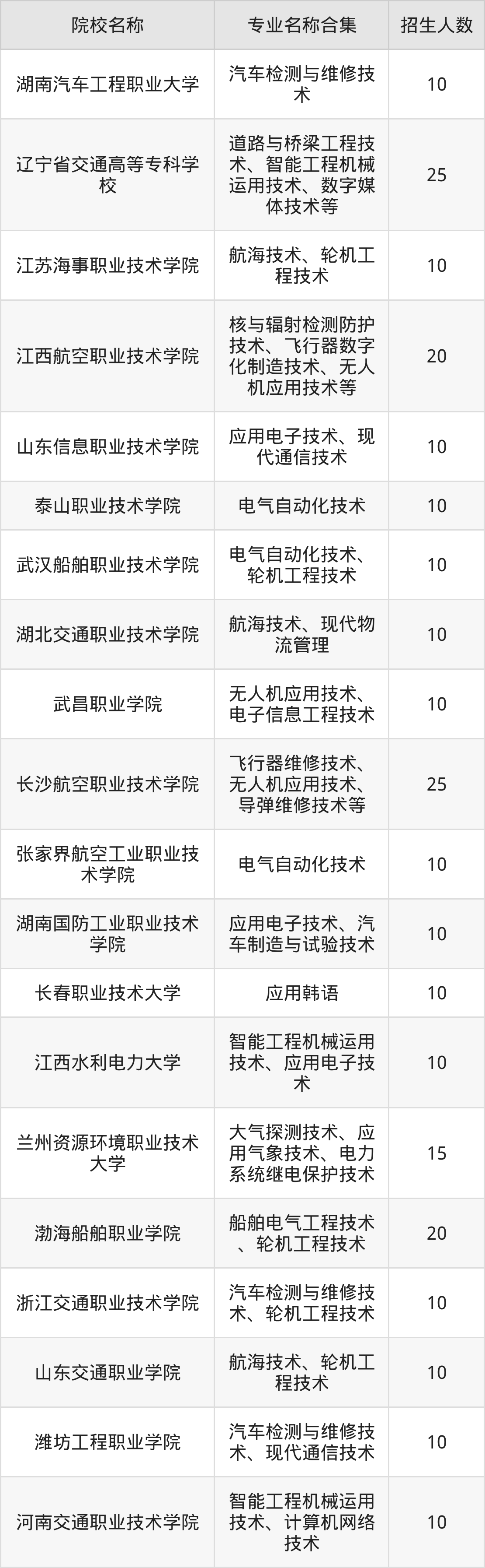 湖南:湖南汽车工程职业大学、长沙航空职业技术学院、张家界航空工业职业技术学院、湖南国防工业职业技术学院