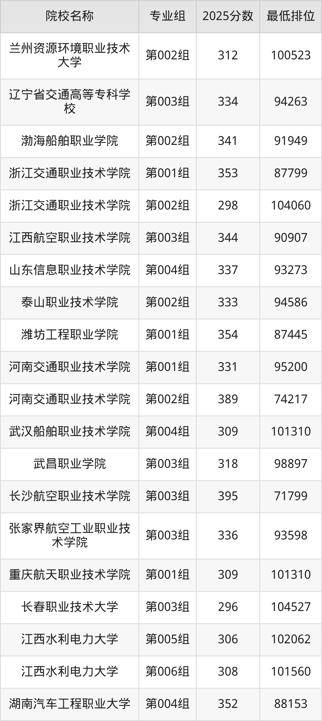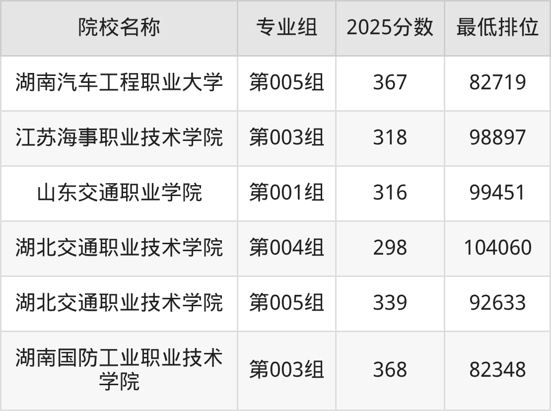 第三梯队(300分及以下):浙江交通职业技术学院(第002组是298分)、长春职业技术大学(第003组是296分)、湖北交通职业技术学院(第004组是298分)