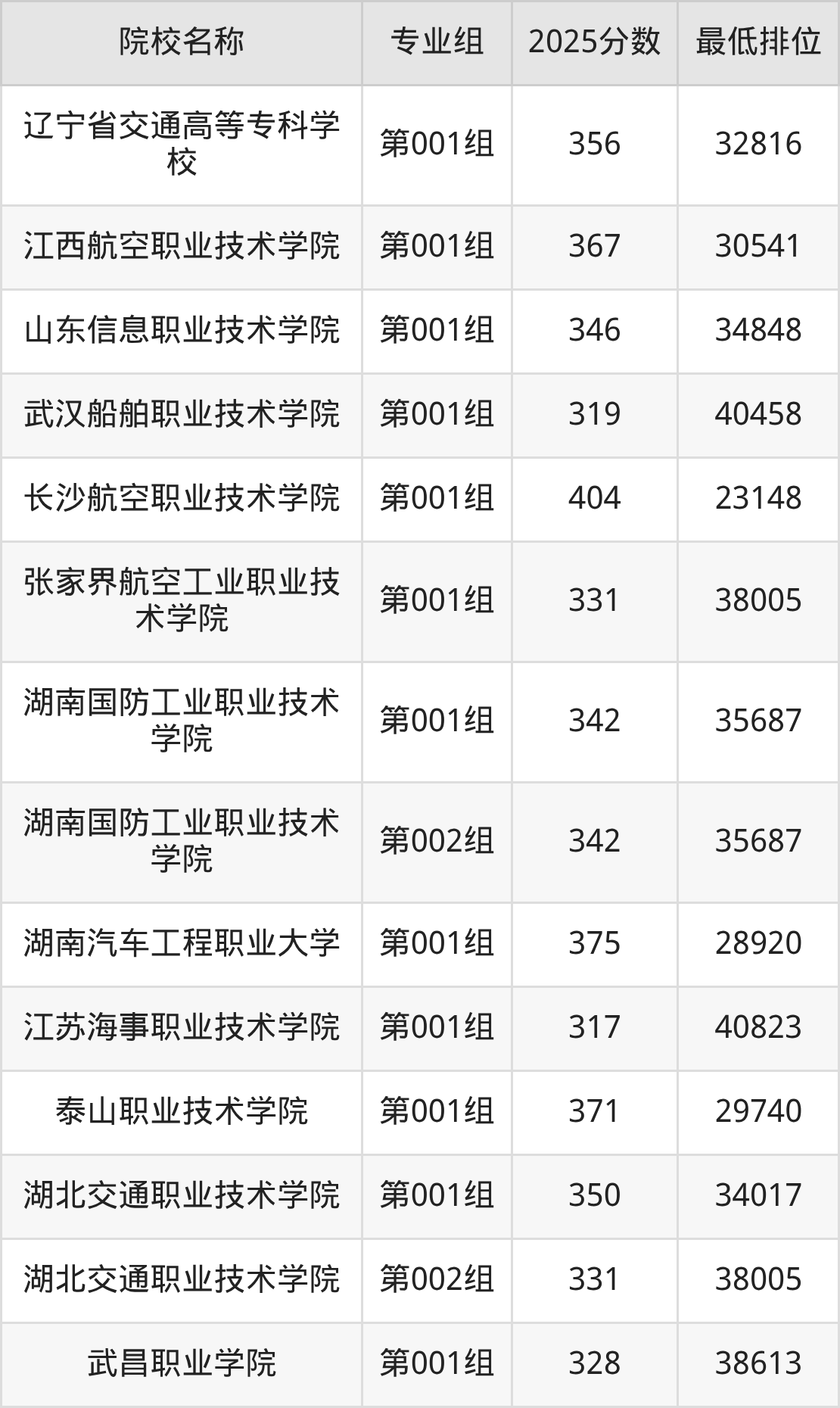 第一梯队(400分+):长沙航空职业技术学院(第001组是404分)