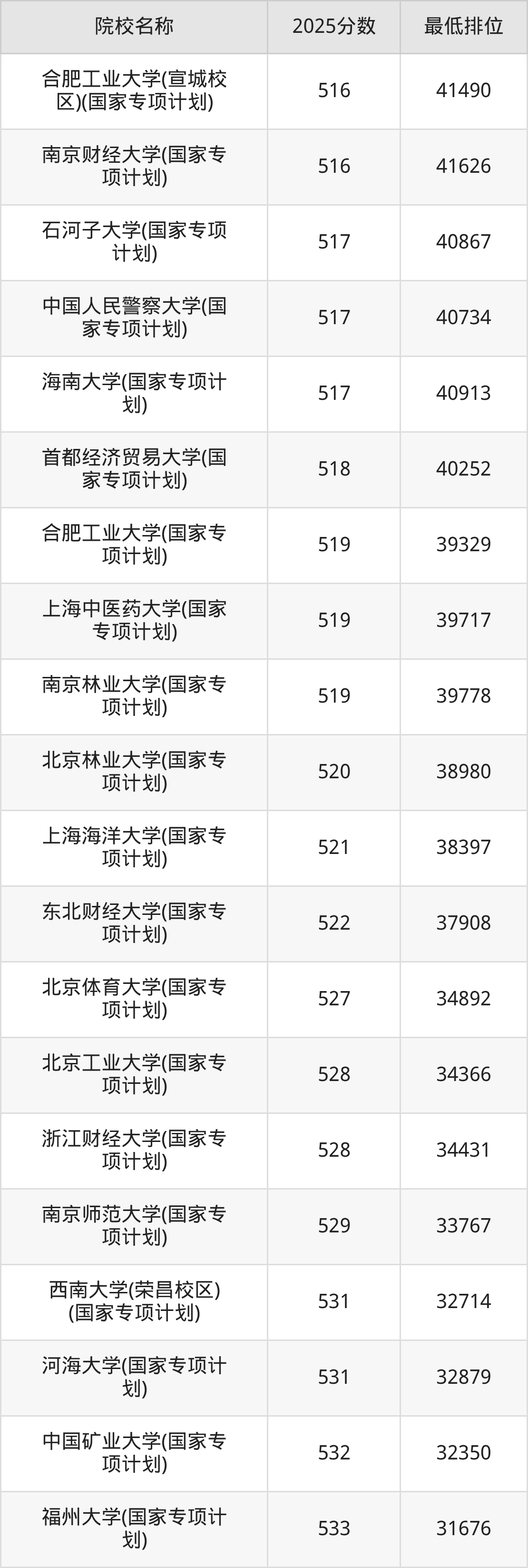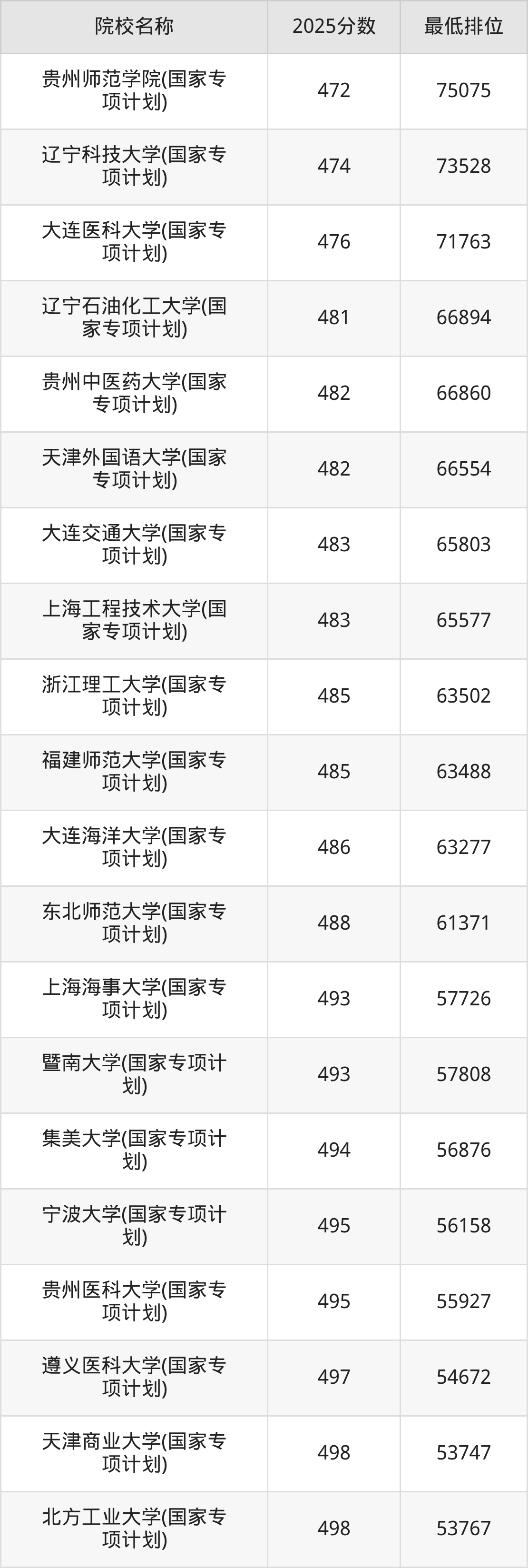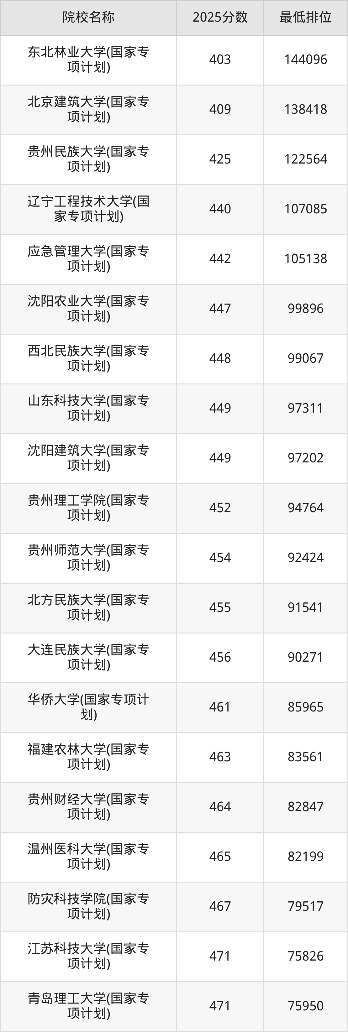 附国家专项计划院校2025年在贵州高考物理类的录取分数线一览表: