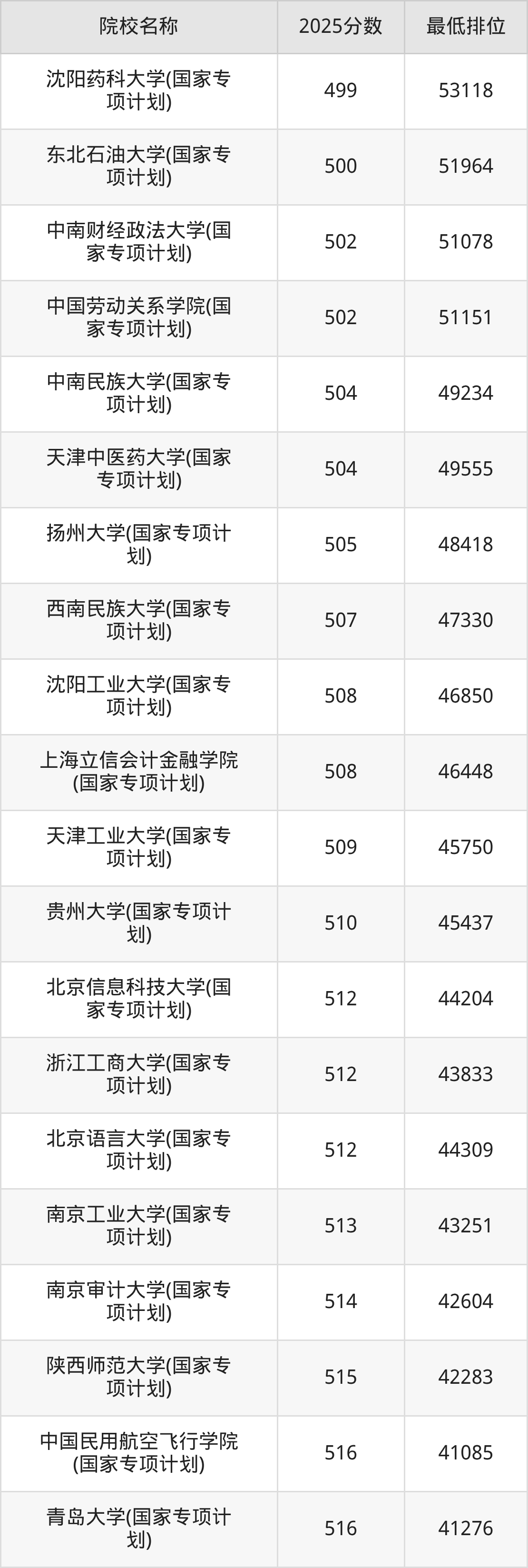 第三梯队(500分及以下):中华女子学院(国家专项计划)(493分)、贵州民族大学(国家专项计划)(498分)