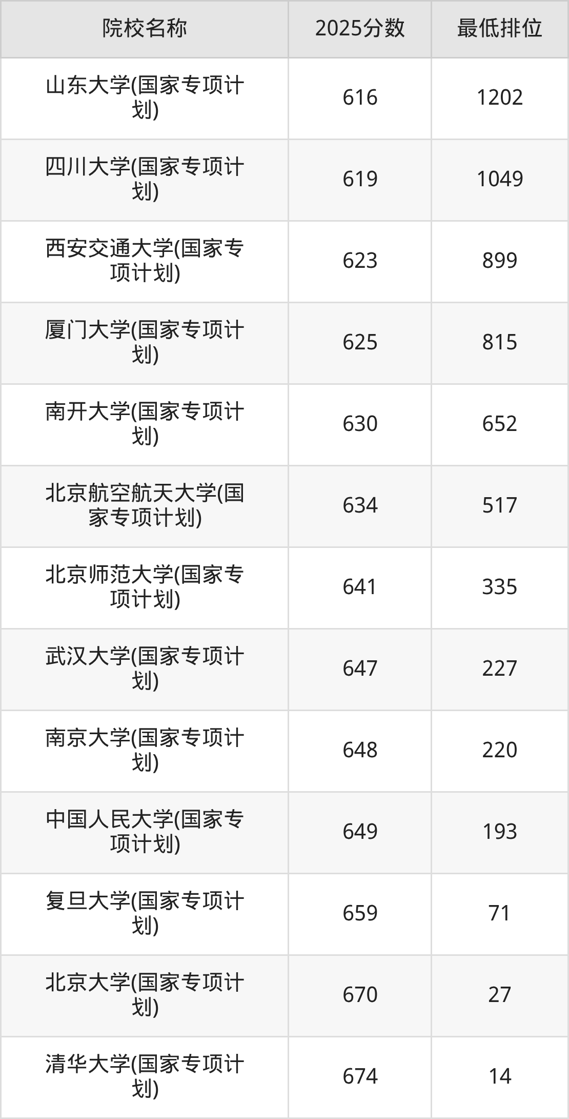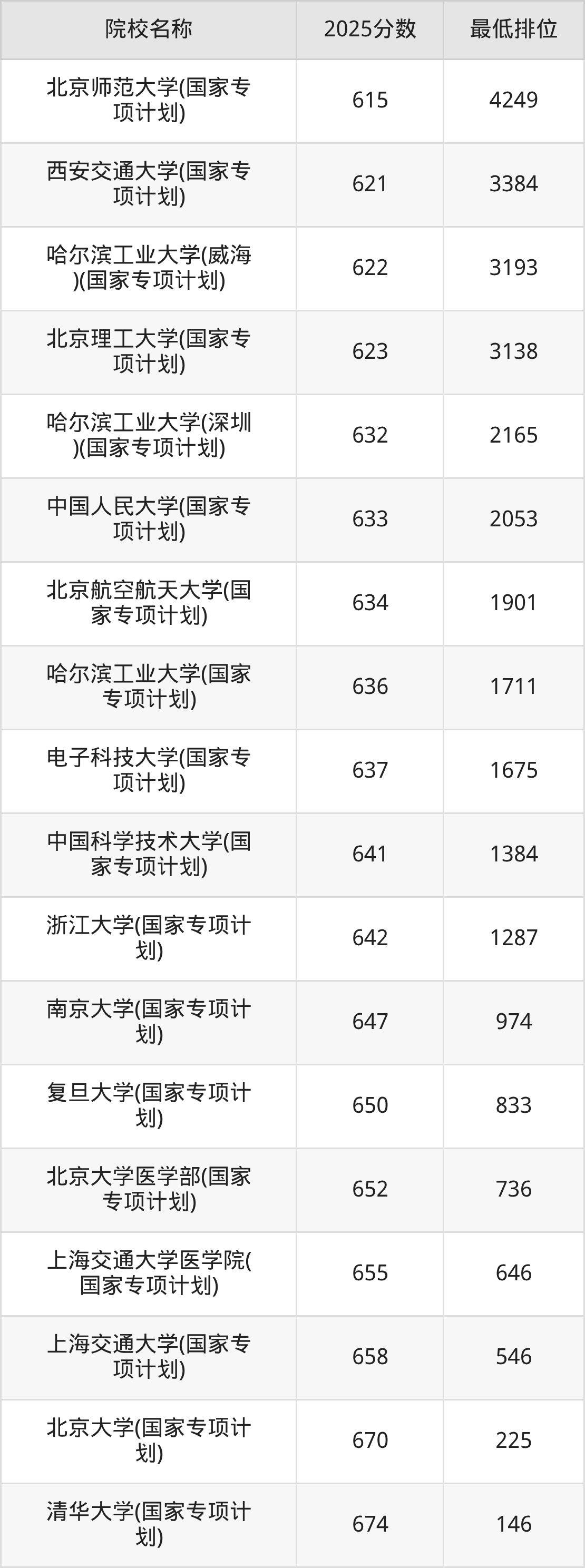 第一梯队(670分+):北京大学(国家专项计划)(670分)、清华大学(国家专项计划)(674分)