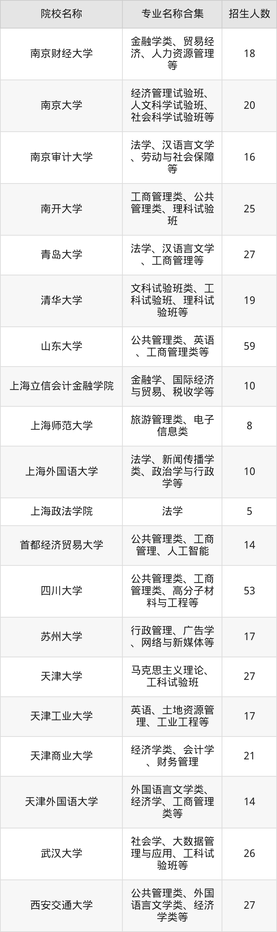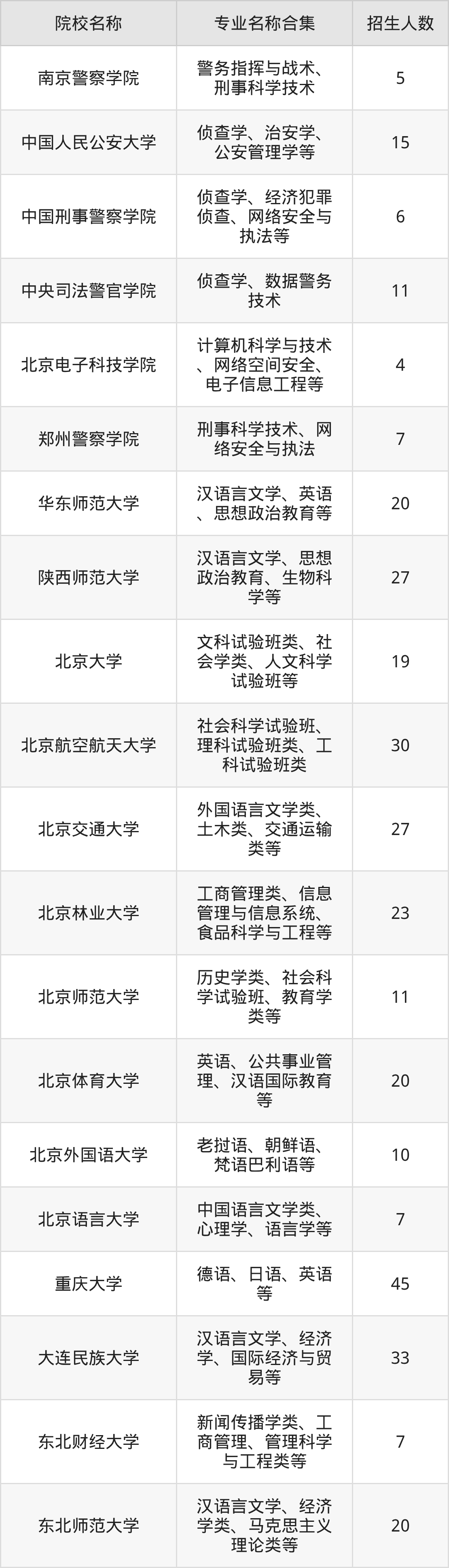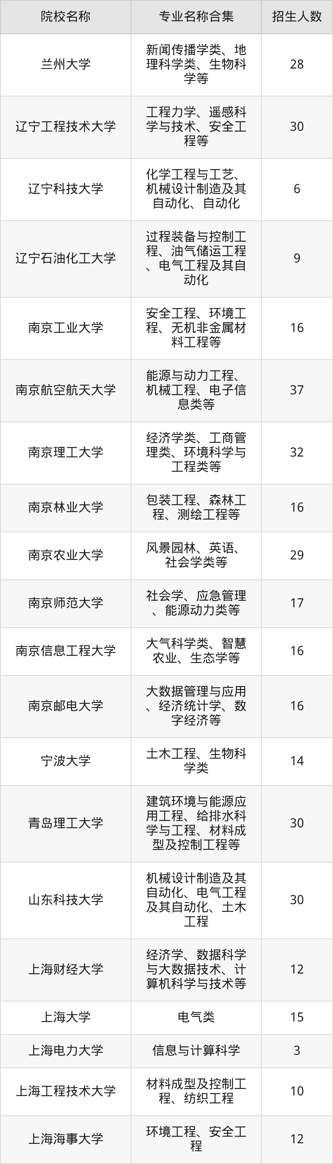 江苏:南京警察学院、南京财经大学、南京大学、南京审计大学、苏州大学、扬州大学、中国矿业大学、东南大学、河海大学、江南大学、江苏大学、江苏科技大学、南京工业大学、南京航空航天大学、南京理工大学、南京林业大学、南京农业大学、南京师范大学、南京信息工程大学、南京邮电大学、中国药科大学