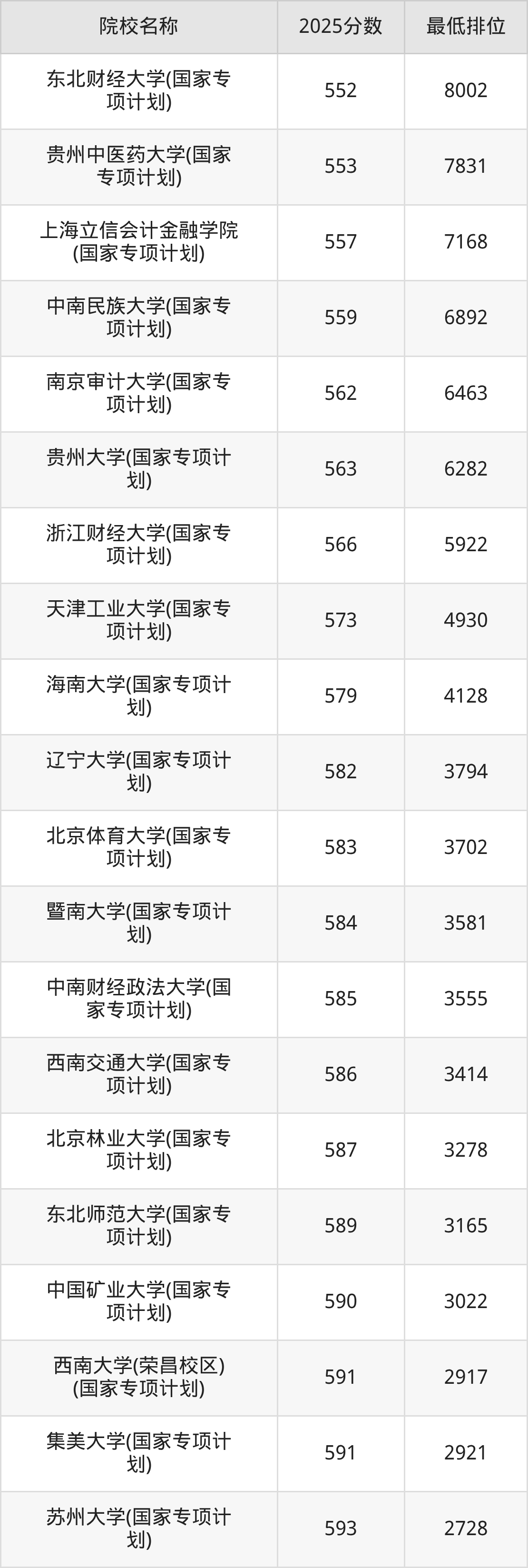 2025年在贵州高考共计178所国家专项计划院校招生,省外高校有169所、省内高校有9所,包含贵州财经大学、贵州大学、贵州民族大学等。再看贵州国家专项计划大学2025年录取分数线,物理类最低分区间是403至674分,历史类最低分区间是493至674分,2026届有意报考的同学请参考!