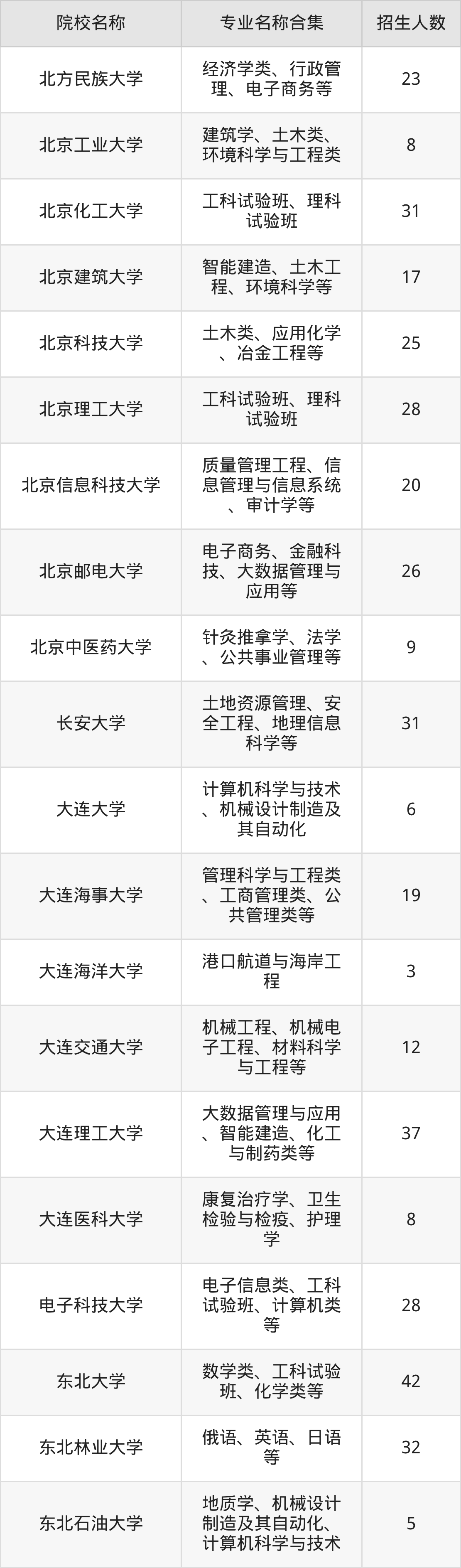 辽宁:中国刑事警察学院、大连民族大学、东北财经大学、辽宁大学、大连大学、大连海事大学、大连海洋大学、大连交通大学、大连理工大学、大连医科大学、东北大学、辽宁工程技术大学、辽宁科技大学、辽宁石油化工大学、沈阳工业大学、沈阳航空航天大学、沈阳建筑大学、沈阳农业大学、沈阳药科大学、中国医科大学