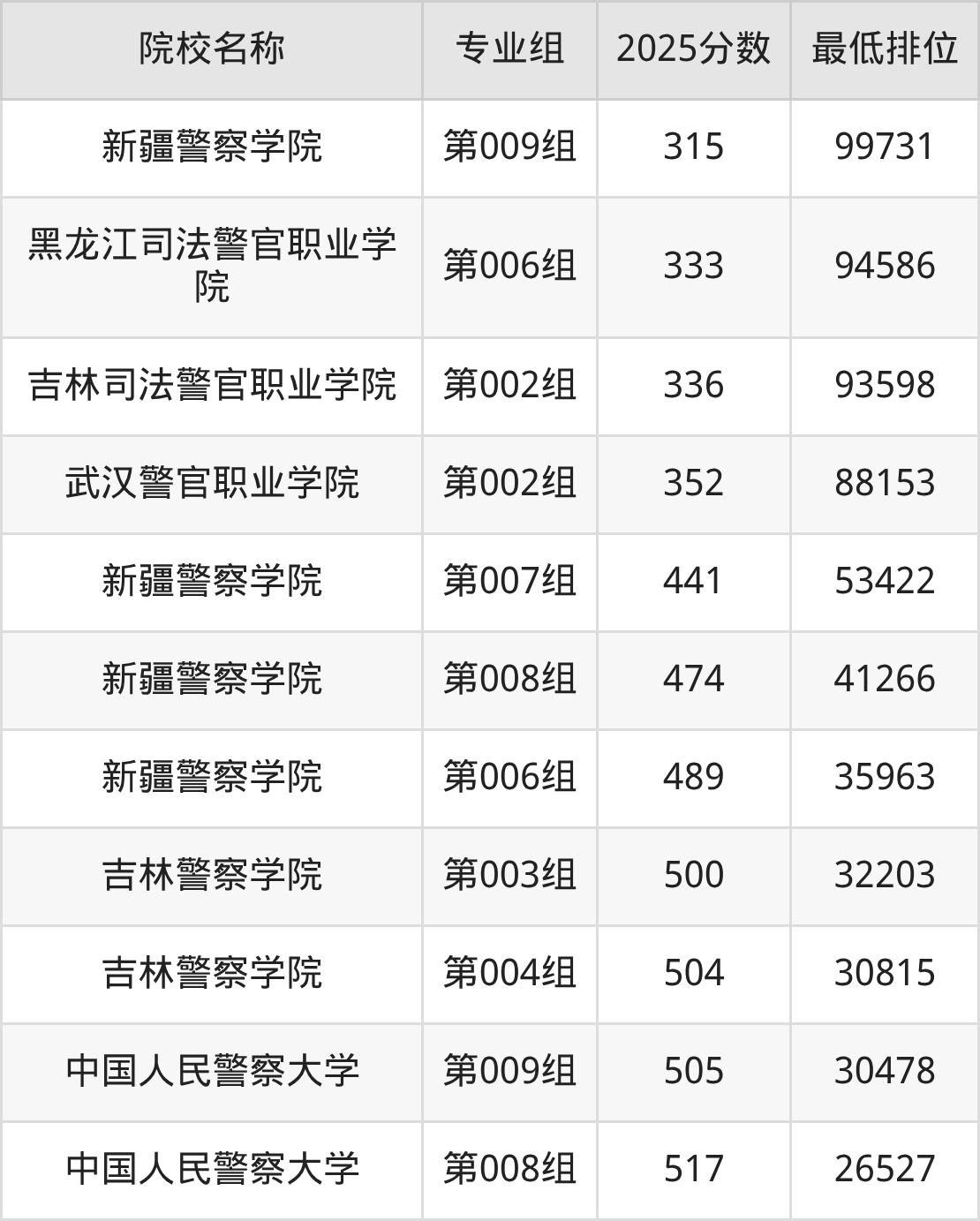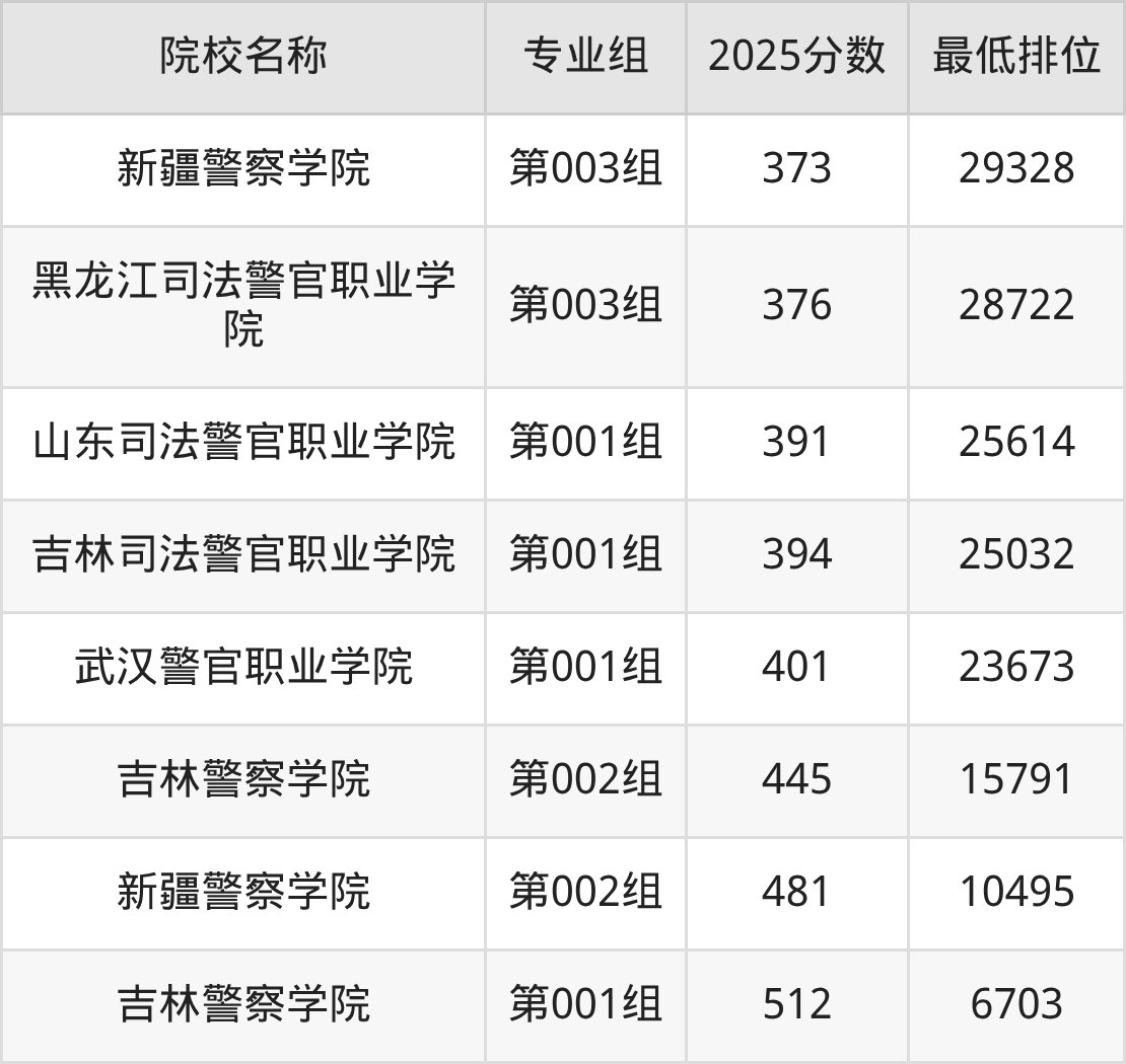 第三梯队(380分及以下):新疆警察学院(第003组是373分)、黑龙江司法警官职业学院(第003组是376分)