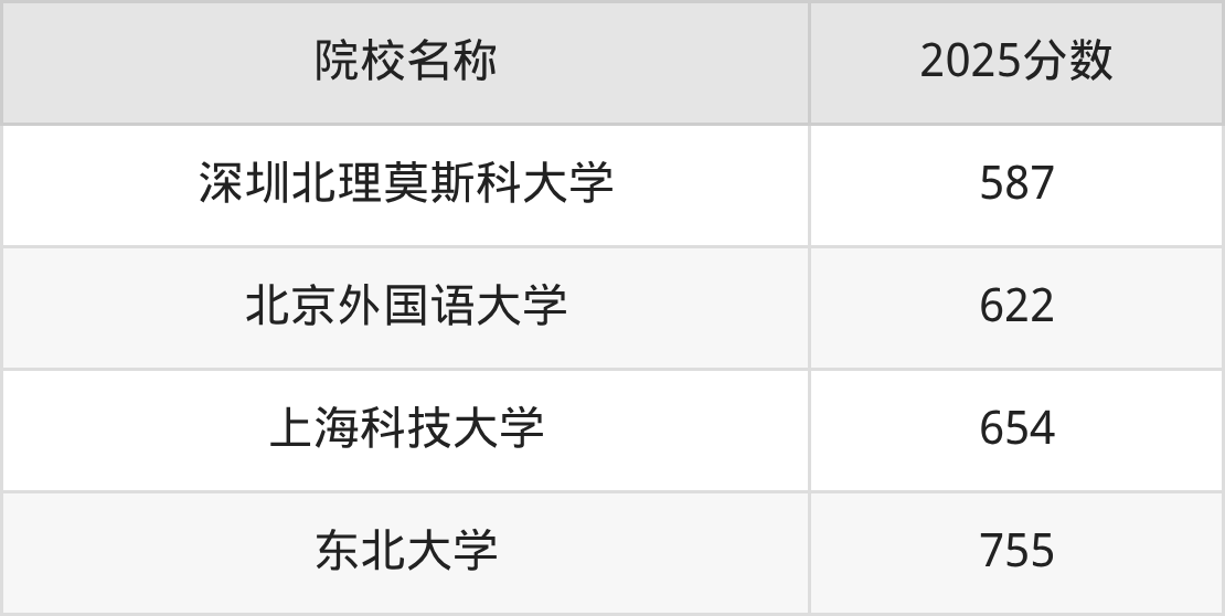 第二梯队(591-749分):北京外国语大学(622分)、上海科技大学(654分)