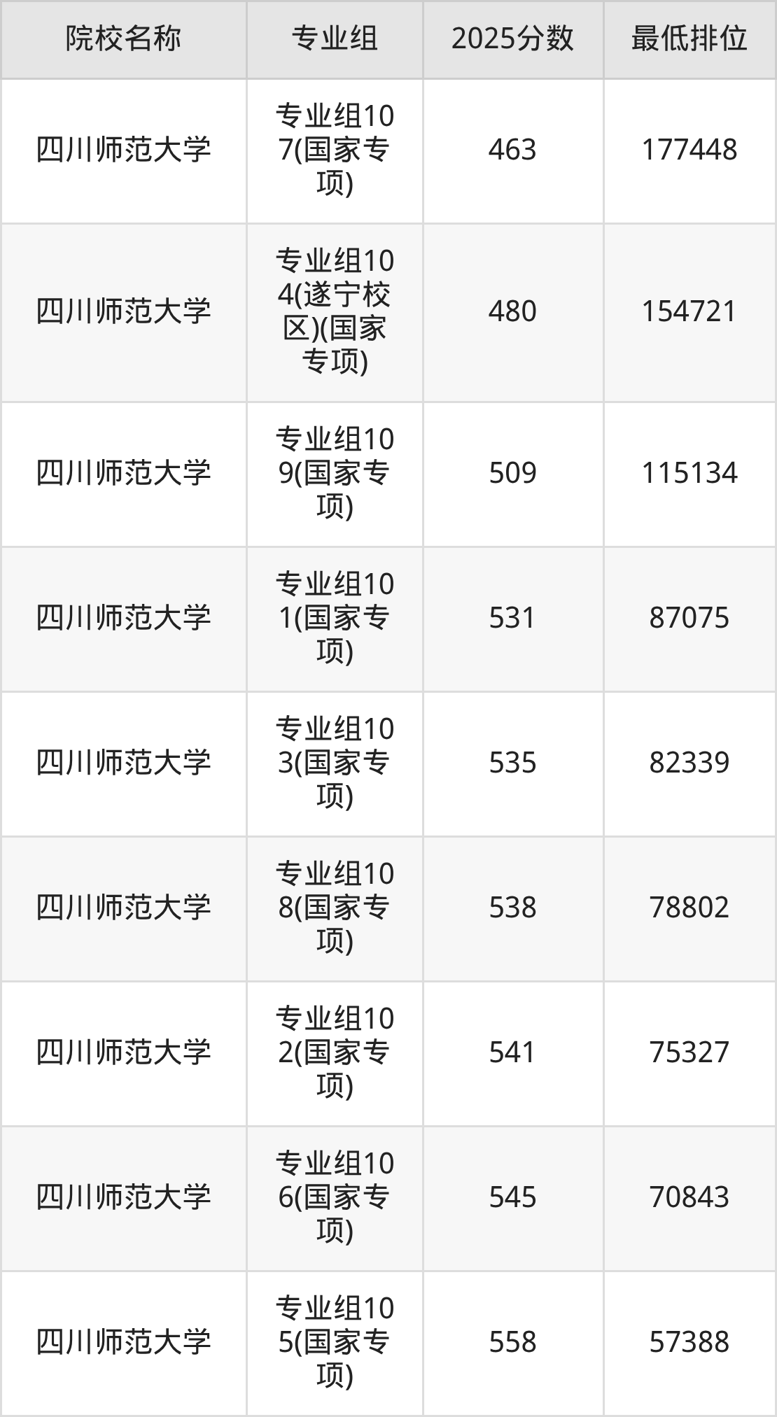 第二梯队(471-549分):四川师范大学(专业组104(遂宁校区)(国家专项)是480分)、四川师范大学(专业组109(国家专项)是509分)、四川师范大学(专业组101(国家专项)是531分)、四川师范大学(专业组103(国家专项)是535分)
