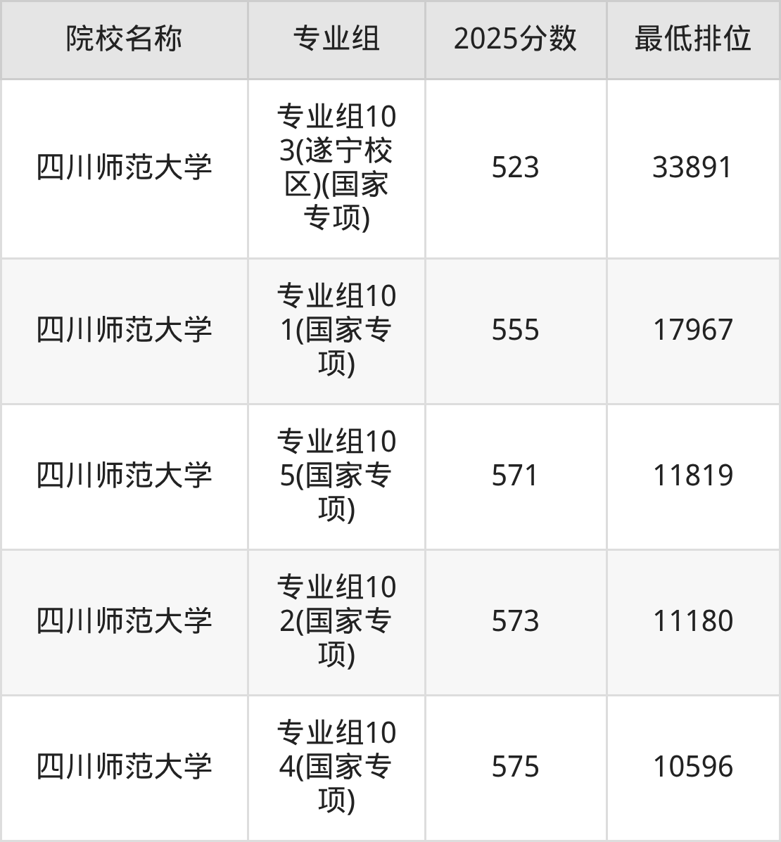 第一梯队(550分+):四川师范大学(专业组105(国家专项)是558分)